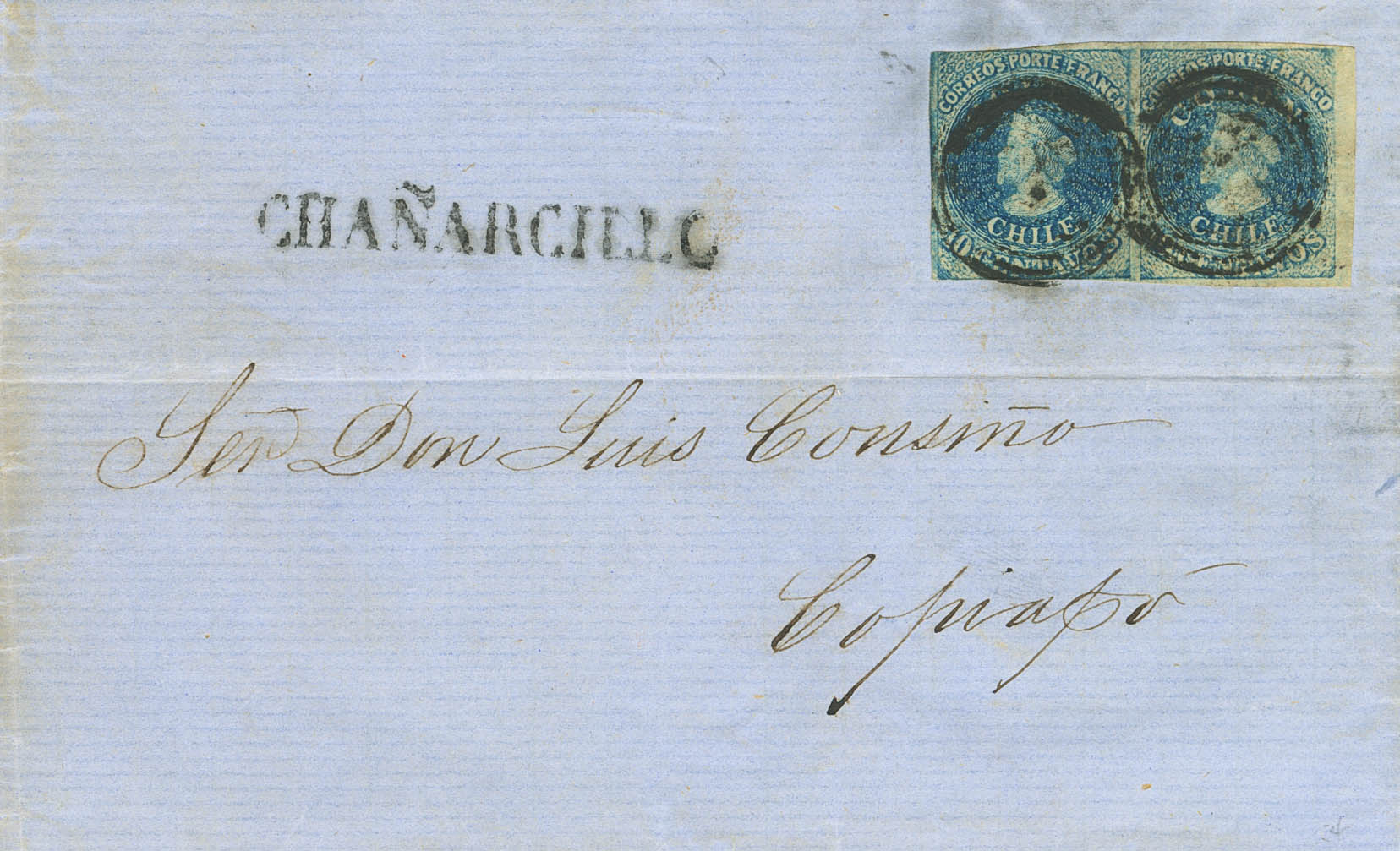 Yvert 6(2). 1859. 10 cts azul, pareja. CHAÑARCILLO a COPIACO. En el frente marca CHAÑARCILLO, en negro. MAGNIFICA Y RARA.