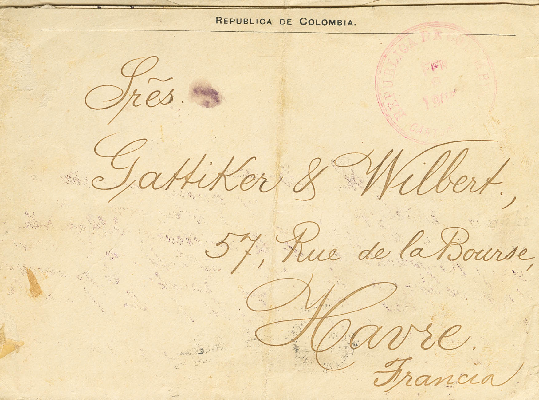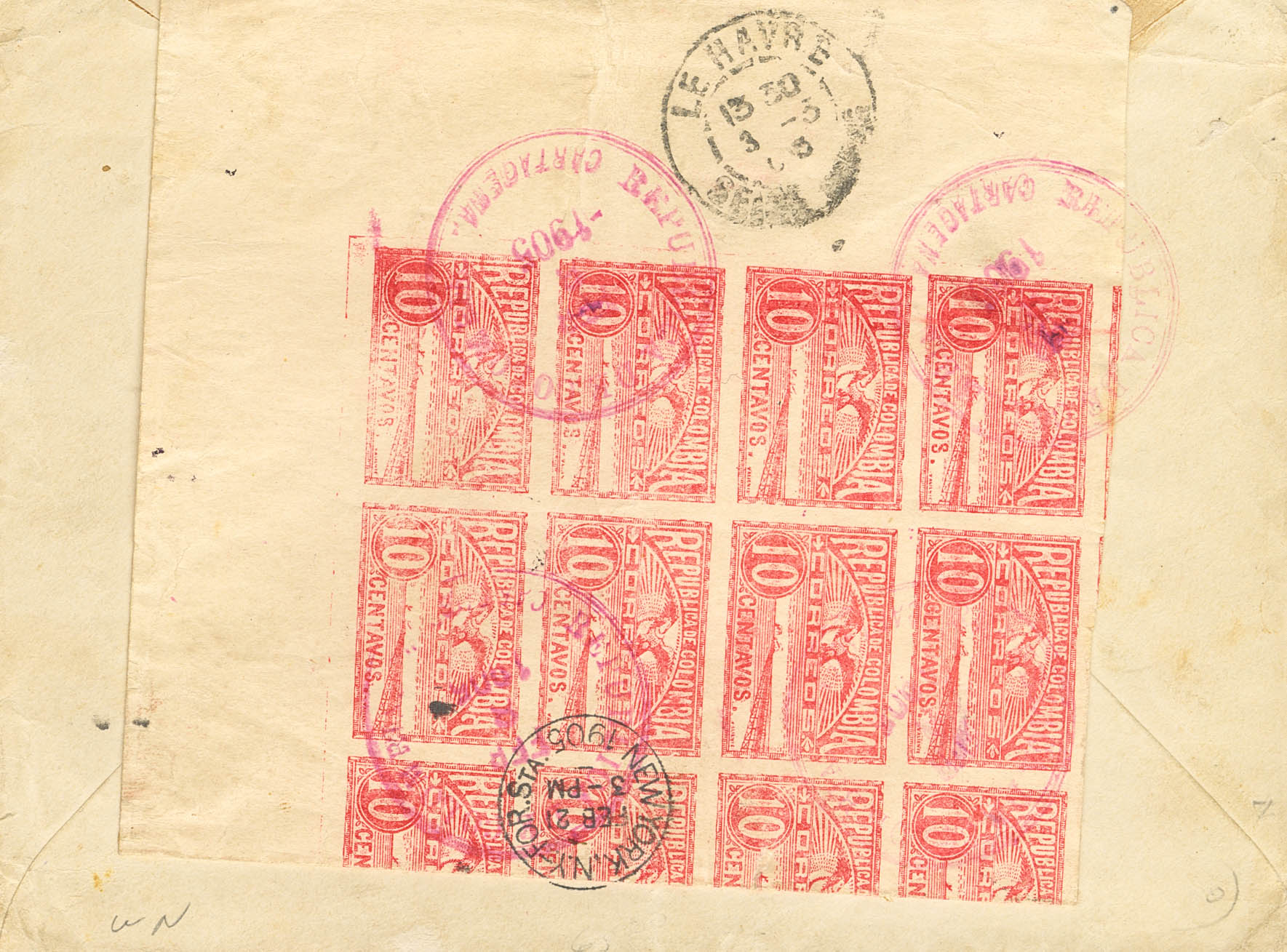 Yvert 140A(20). 1905. 10 ctvos rojo SIN DENTAR, bloque de veinte (plegado y adherido por un lateral en el reverso). CARTAGENA a LE HAVRE (FRANCIA). En el frente y sobre los sellos, fechador REPUBLICA DE COLOMBIA / CARTAGENA, en violeta y al dorso tránsito NEW YORK y llegada (sobre los sellos). MAGNIFICA.