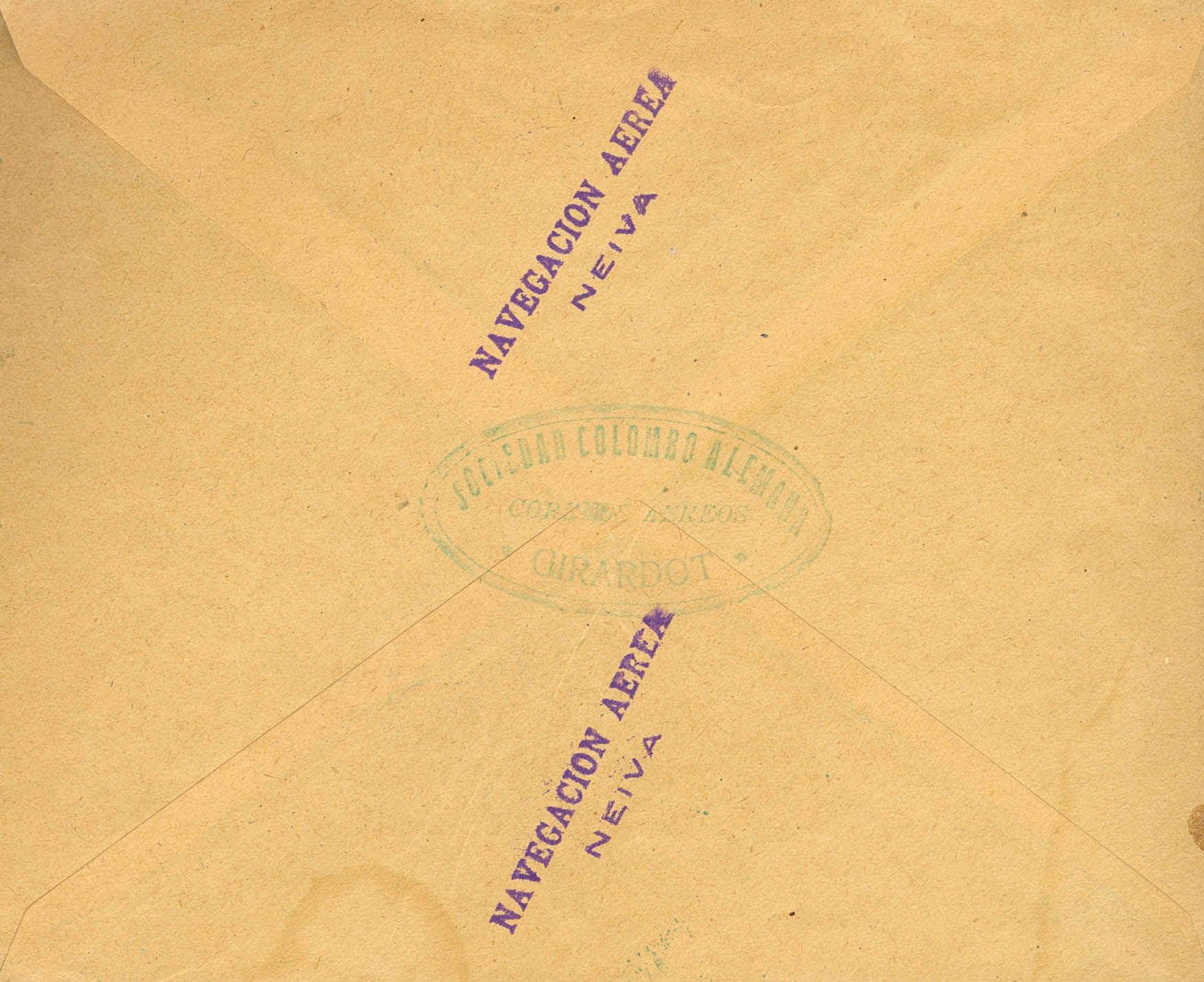 1921. VALOR 0,10 $ (a máquina de escribir) sobre 50 ctvos verde claro y diversos valores. Correo Aéreo de GIRARDOT a NEIVA. Matasello SOCIEDAD COLOMBO ALEMANA / CORREOS AEREOS / GIRARDOT de SCADTA sobre el sello aéreo y fechador duplex NEIVA sobre los otros valores, al dorso marca lineal NAVEGACION AEREA / NEIVA, en violeta. MAGNIFICA Y MUY RARA.