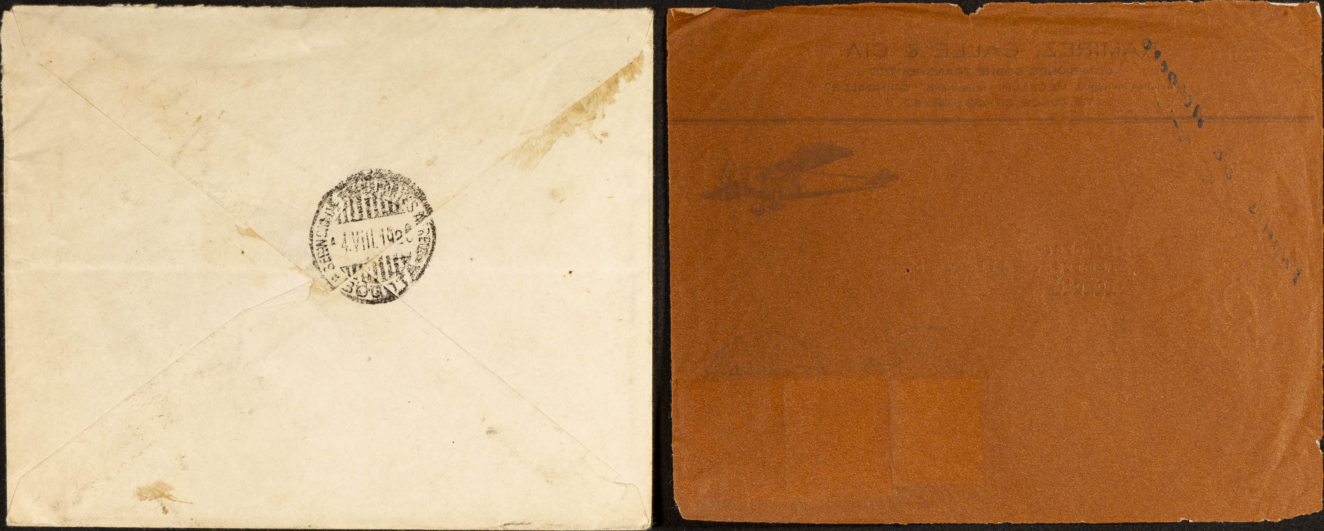 Yvert 47, 245. 1928. 30 ctvos azul y 4 ctvos azul. Correo Aéreo de CALAMAR a BOGOTA. Matasello SERVICIO POSTAL AEREO SCADTA / CALAMAR y llegada al dorso, se incluye un frontal (manchitas del tiempo) de PUERTO BERRIO a BOGOTA, circulado a través de SCADTA. MAGNIFICAS Y RARISIMAS.