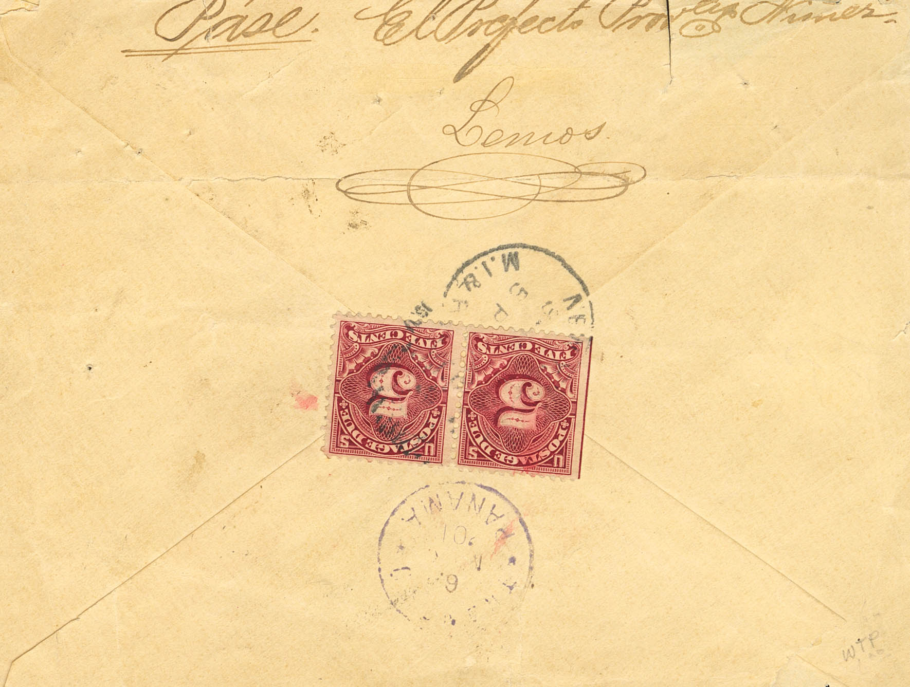 Yvert 5B. (1900ca). 10 ctvos negro sobre blanco SIN DENTAR. TUMACO a NUEVA YORK (U.S.A.). Matasello CORREOS NACIONALES / TUMACO (CAUCA), en el frente anotación manuscrita "Por Vapor" y marca de tasa COLLECT / POSTAGE / 10 CENTS, al dorso dos sellos de tasa de 5 cts de Estados Unidos y tránsito PANAMA. MAGNIFICA Y MUY RARA.
