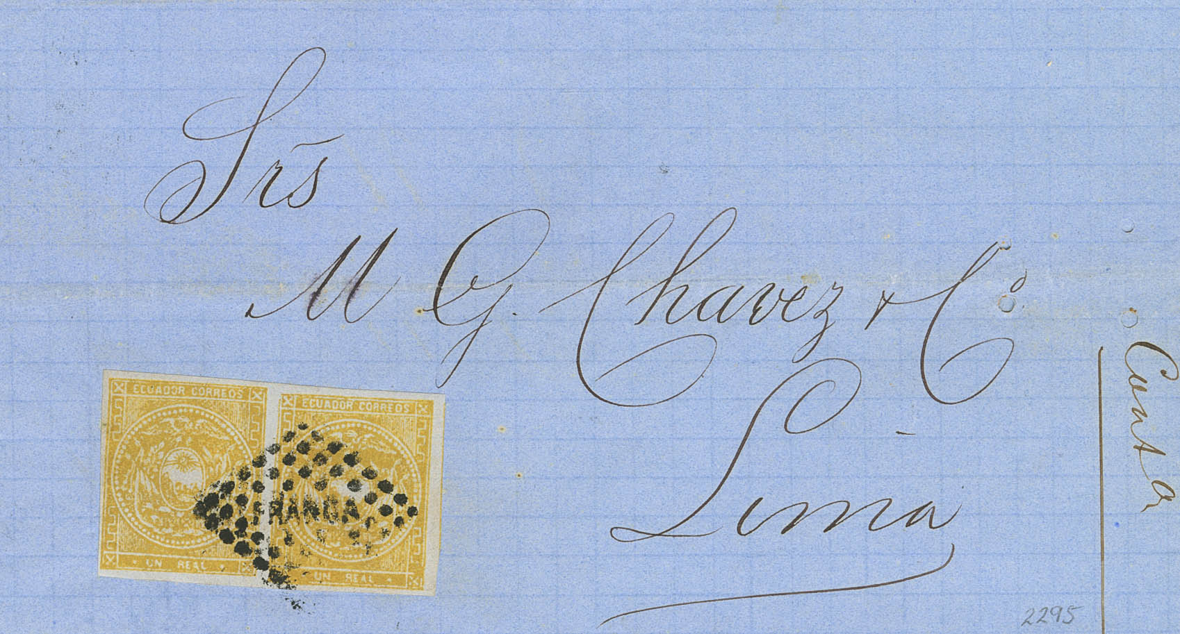 Yvert 3b(2). 1871. 1 real amarillo sobre azulado, pareja. GUAYAQUIL a LIMA (PERU). Matasello ROMBO DE PUNTOS FRANCA. MAGNIFICA Y RARO SELLO EN CARTA.