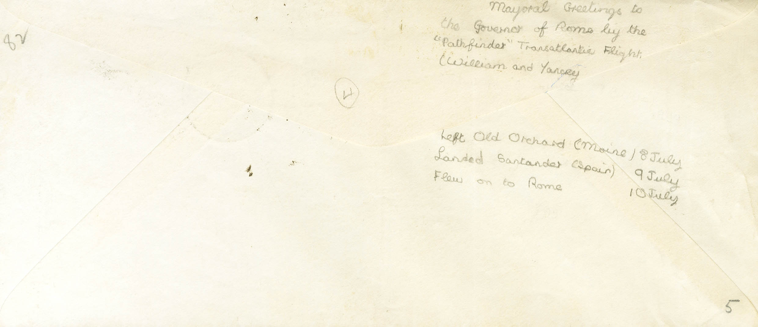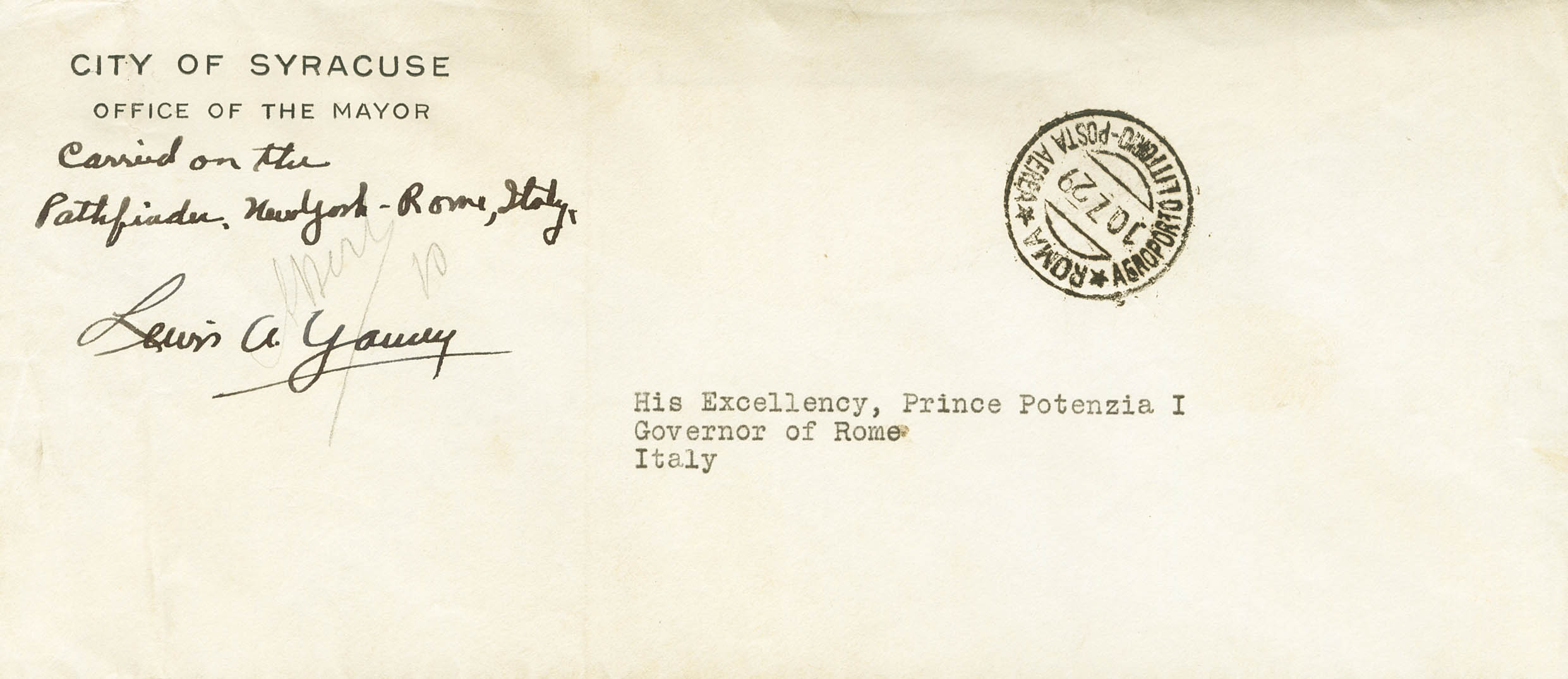 1929. Sobre sin franquear de SYRACUSE a ROMA (ITALIA). Anotación manuscrita "Carried on the Pathfinder New York-Rome-Italy" y firmada por el piloto Lewis Alonzo Yancey y fechador ROMA / AEROPORTO LITTORIO-POSTA AEREA. MAGNIFICA Y MUY RARA, SOLO SE TRANSPORTARON DIECINUEVE CARTAS EN ESTE VUELO TRANSATLANTICO.