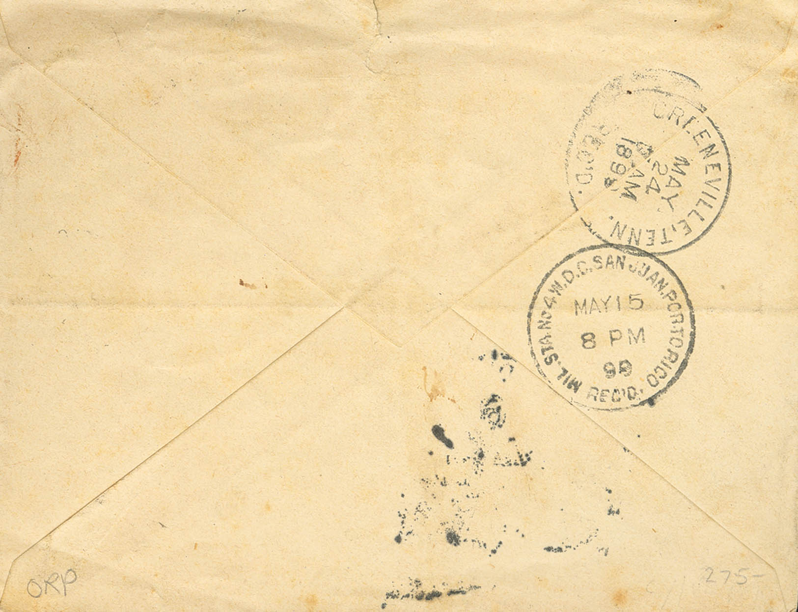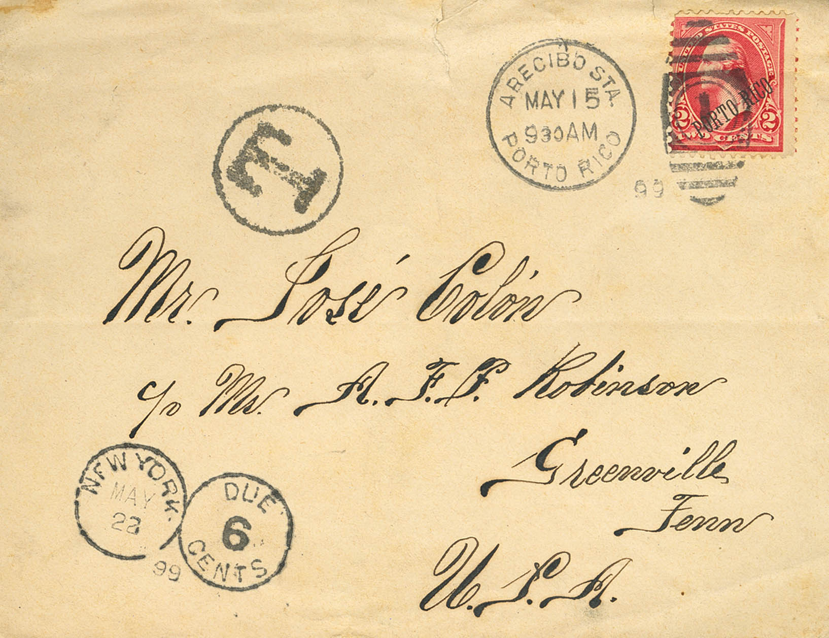 175. 1899. 2 ctvos rojo. ARECIBO a GREENVILLE (UU.S.A.). Matasello duplex ARECIBO STA. / PORTO RICO / 1, tasada en tránsito por Nueva York aplicando fechador de tasa NEW YORK / DUE / 6 / CENTS, al dorso tránsito San Juan y llegada. MAGNIFICA.