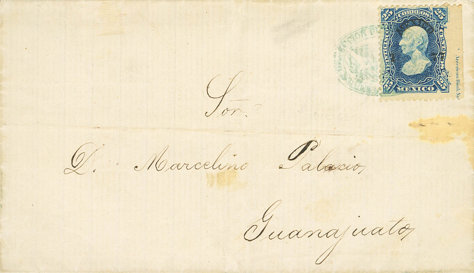 Yvert 58A. 1877. 25 cts azul, borde de hoja con leyenda "American Bank No". MEXICO a GUANAJUATO. Matasello oval DIRECCION DE DILIGENCIAS / GENERALES, en azul. MAGNIFICA. (Schatzkes 829).