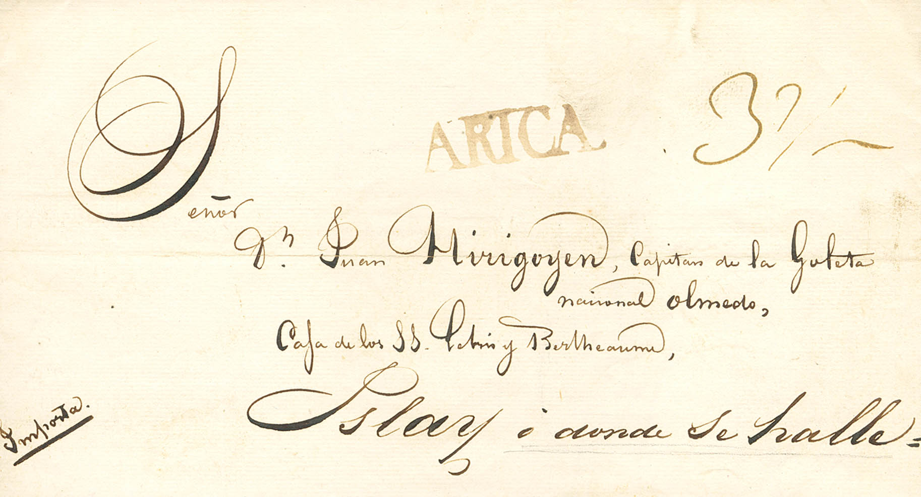 1831. ARICA a ISLAY. Marca ARICA, en tinta de escribir y porteo manuscrito "3 ½". MAGNIFICA Y RARA. (Colareta 4, Suplemto 1981)