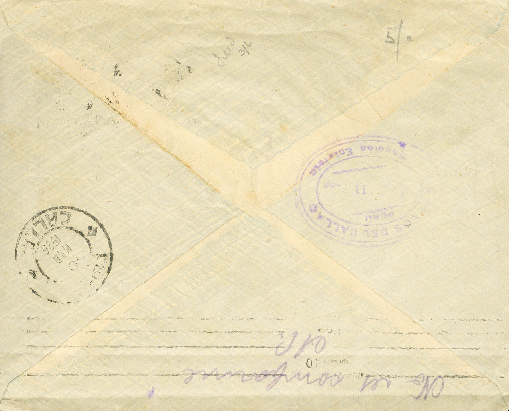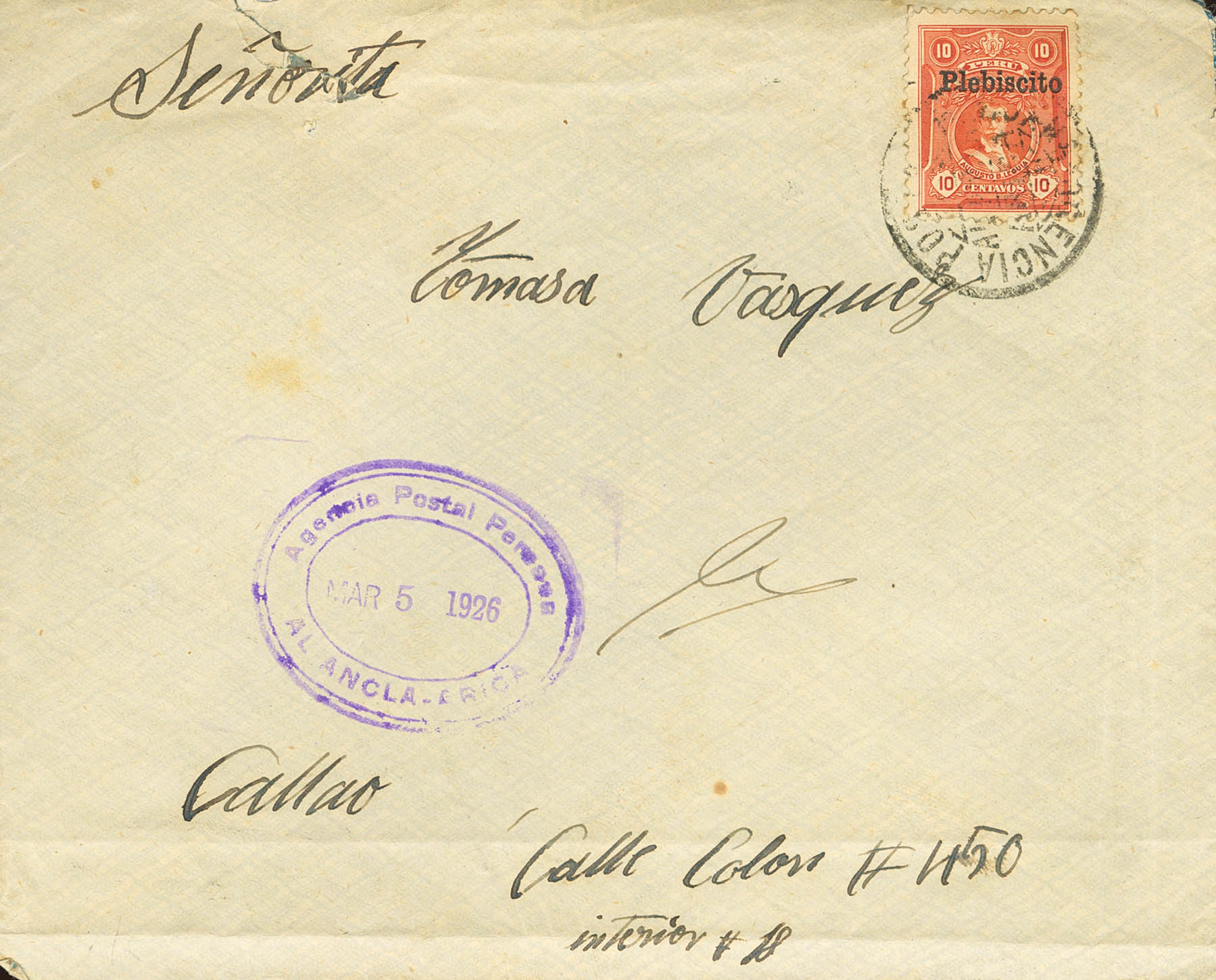 Yvert 219. 1925. 10 ctvos rojo sobrecarga PLEBISCITO. ARICA a CALLAO. En el frente fechador oval AGENCIA POSTAL PERUANA / AL ANCLA-ARICA, en violeta y al dorso llegada. MAGNIFICA Y RARA CIRCULADA A TRAVES DE LA AGENCIA POSTAL PERUANA ANTES DE LA FIRMA DEL TRATADO DE LIMA, QUE DETERMINO LA PERTENENCIA DE ARICA A CHILE.