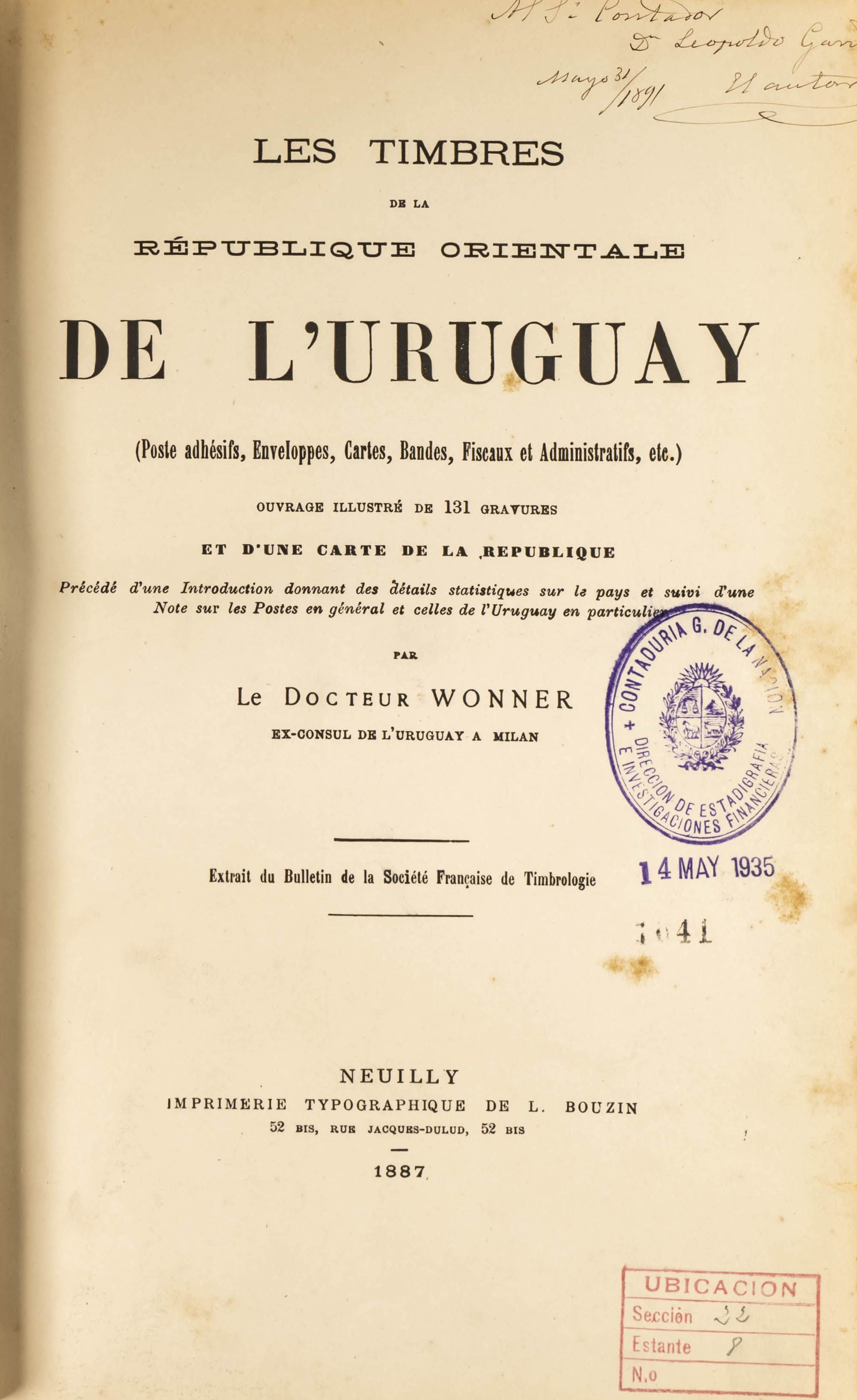1887. LES TIMBRES DE LA REPUBLIQUE ORIENTALE DE L´URUGUAY. Dr. Wonner (Consul de L´Uruguay a Milán). Imprimerie Typographique de L.Bouzin, 1887 (manchitas del tiempo).
