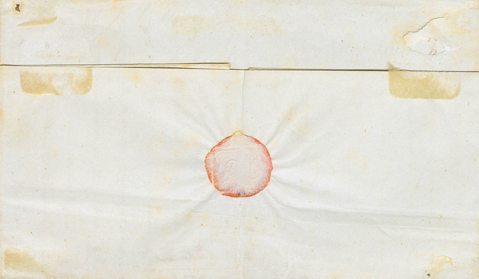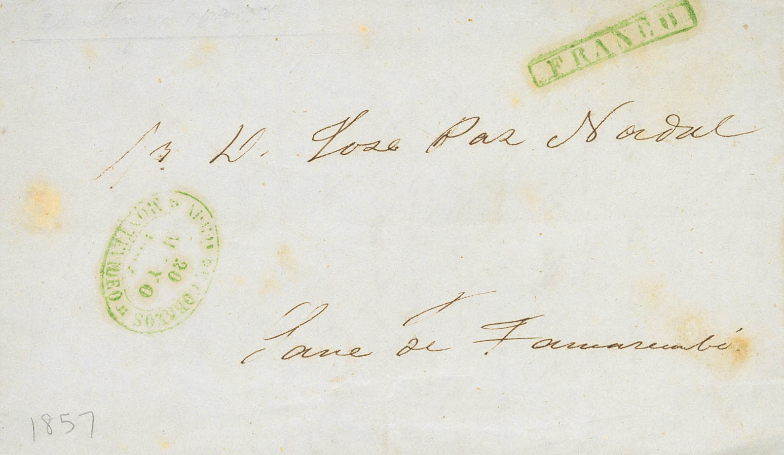 1857. MONTEVIDEO a TACUAREMBO. Fechador oval ADMON. DE CORREOS / MONTEVIDEO y marca FRANCO, ambas en verde. MAGNIFICA.