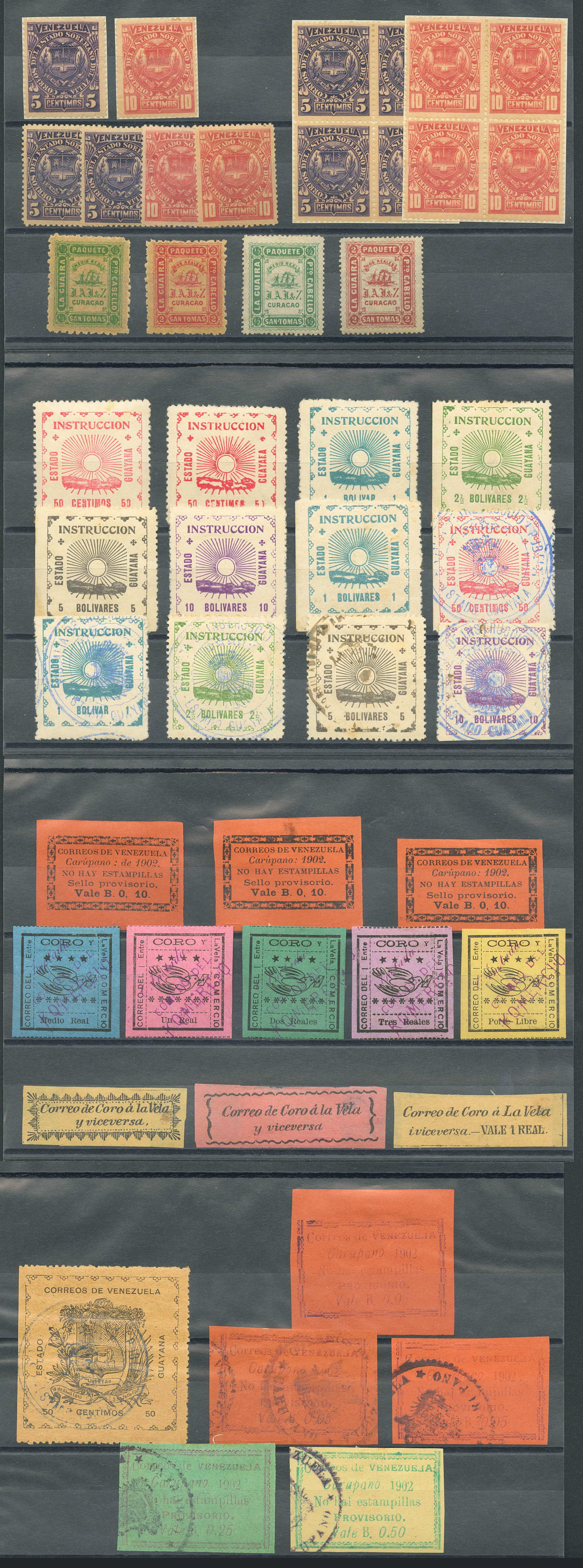 ★/(1900ca). Interesante conjunto de sellos de Venezuela de principio del siglo XX, en nuevo y usado, incluye varios Provisionales de Carúpano de 1902, tres "tiritas" de Correo de Coro a La Vela, cinco viñetas de Coro a La Vela, fiscales del Estado de Guayana de 1902 con alguna variedad y cuatro sellos de la Compañía J.A. Jesurum de Santo Tomás La Guaira, en nuevo. ALTO VALOR DE CATALOGO. A EXAMINAR.