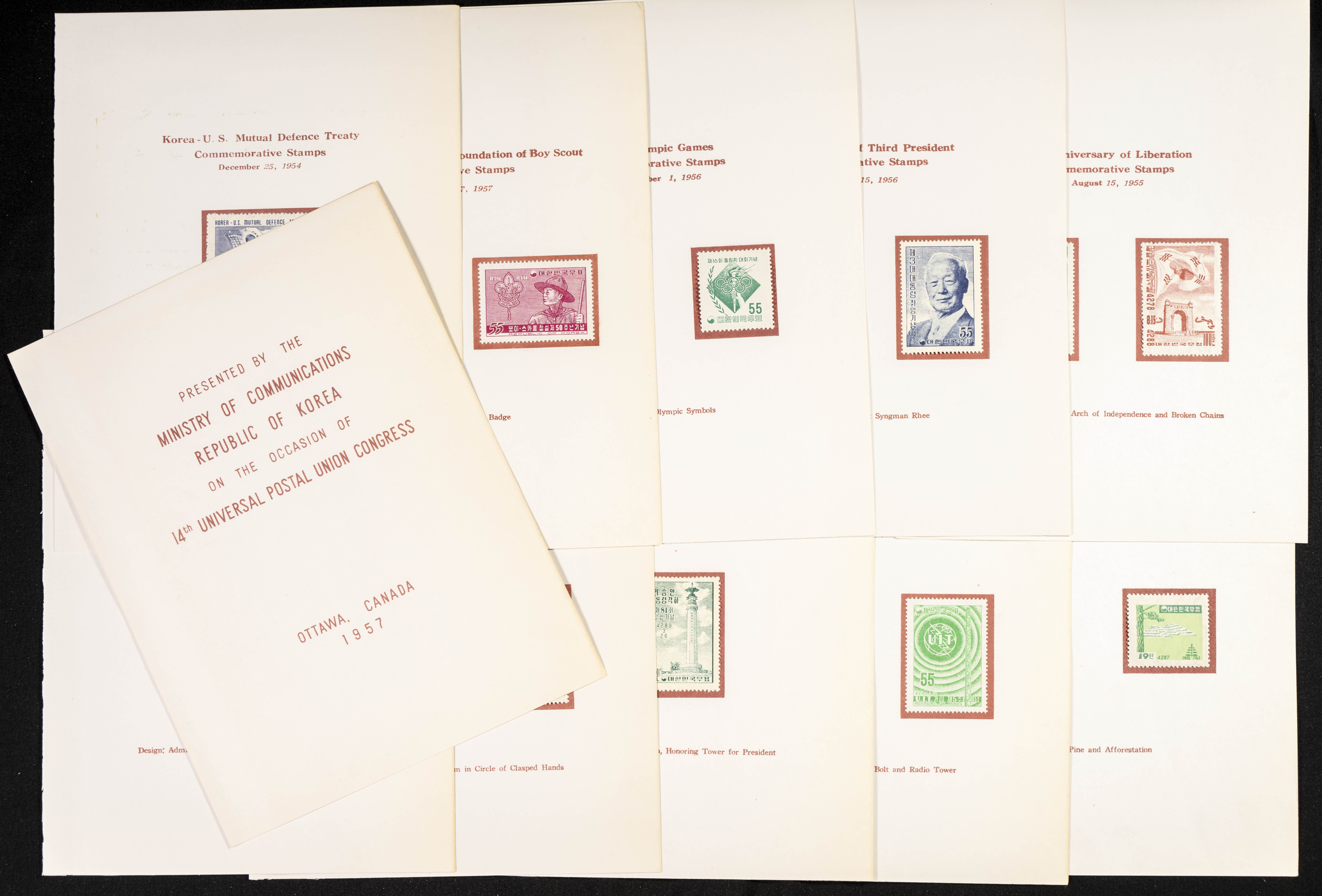 ★1957. Interesante conjunto de diez hojas y la portada del cuadernillo (separadas) realizado por el Ministro de Comunicaciones de Corea del Sur con motivo del 14º Congreso de la Unión Postal Universal celebrado en Otawa, Canadá en 1957, incluye ocho series y dos sellos nuevos de 1955, 1956 y 1957. A EXAMINAR.