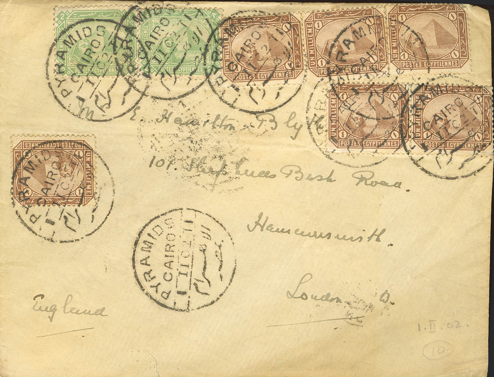 Yvert 36(6), 37(2). 1902. 1 m castaño, seis sellos y 2 m verde, dos sellos. EL CAIRO a LONDRES (GRAN BRETAÑA). Matasello fechador bilingüe PYRAMIDS / CAIRO, al dorso llegada. MAGNIFICA.