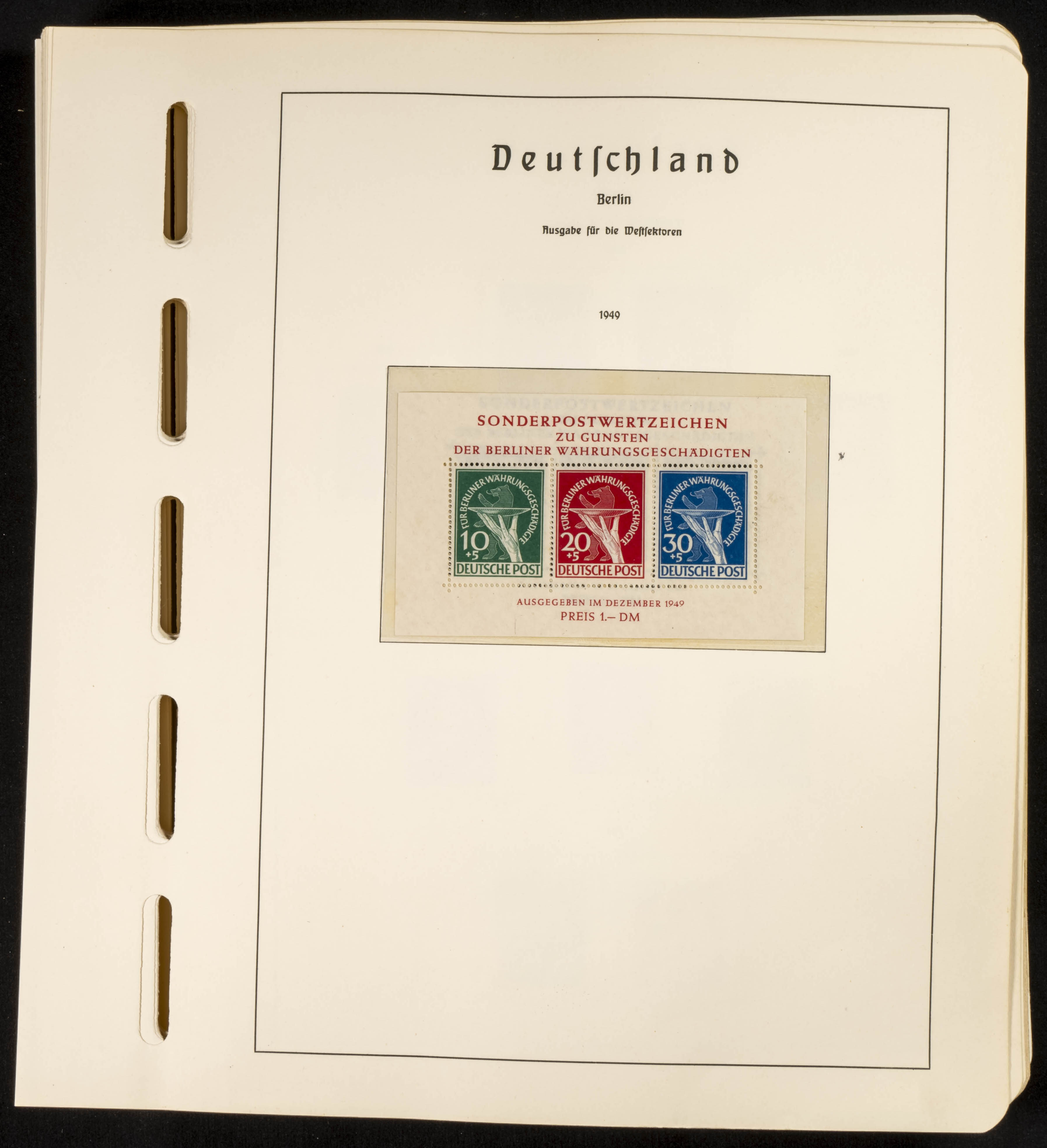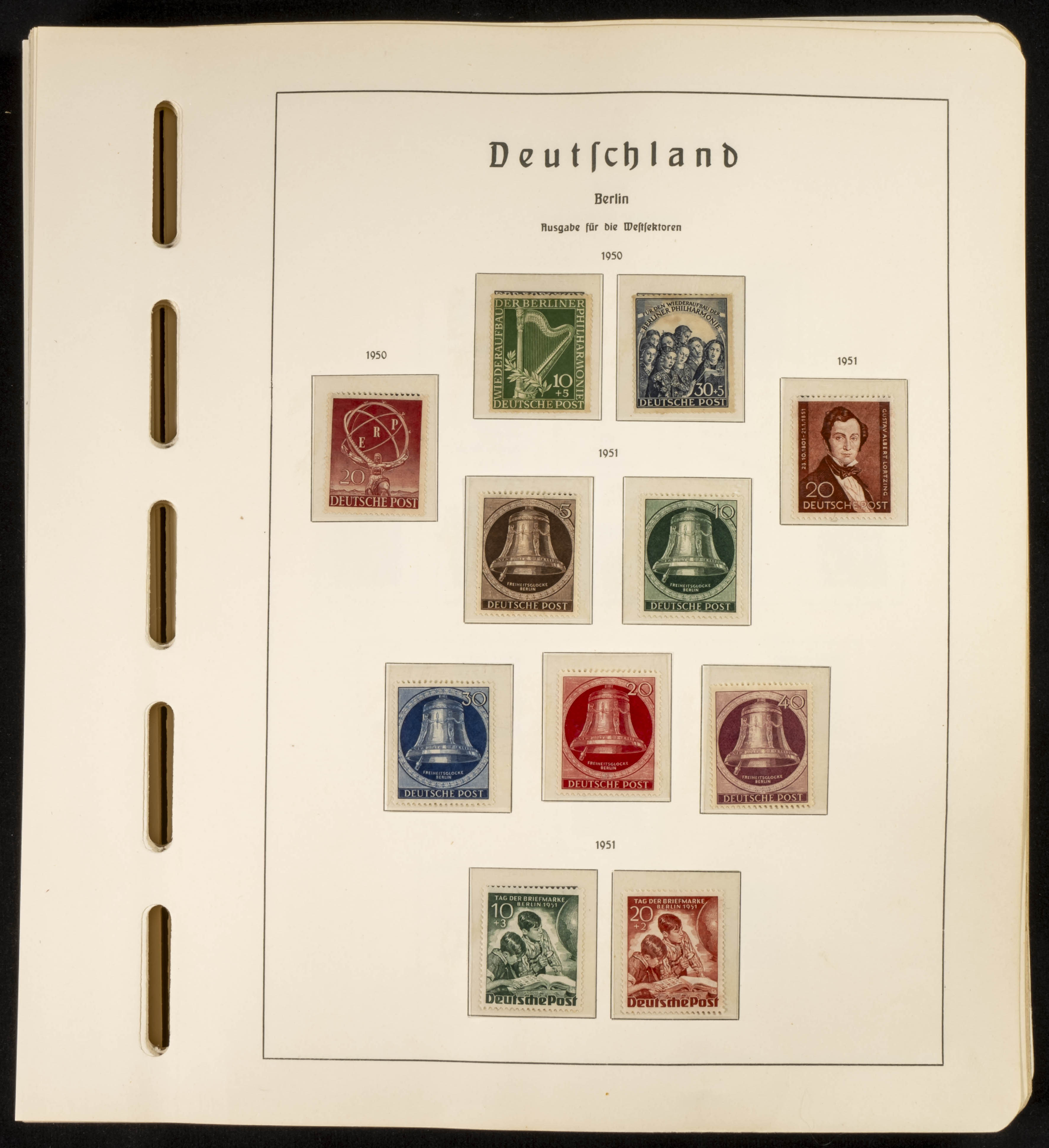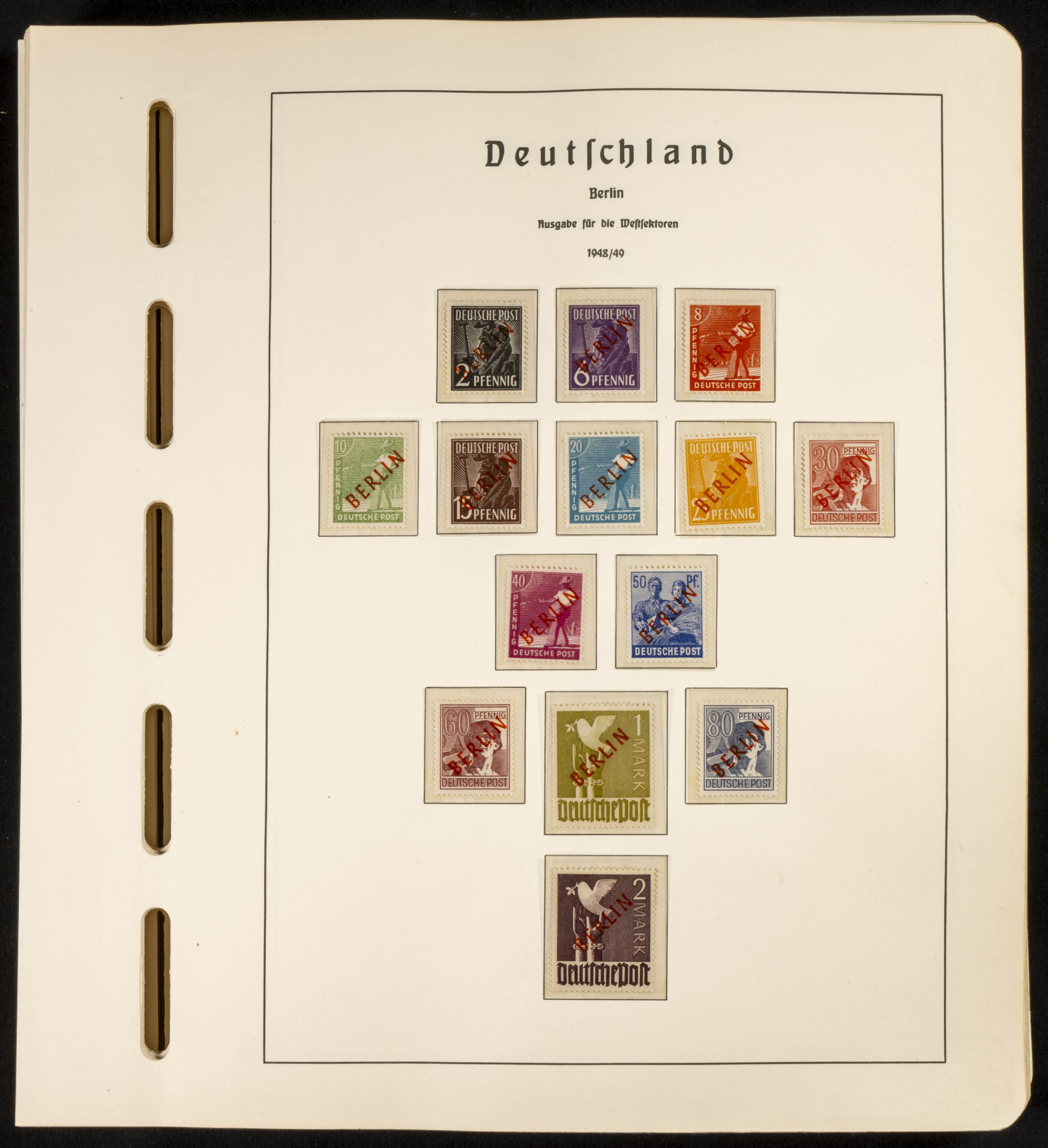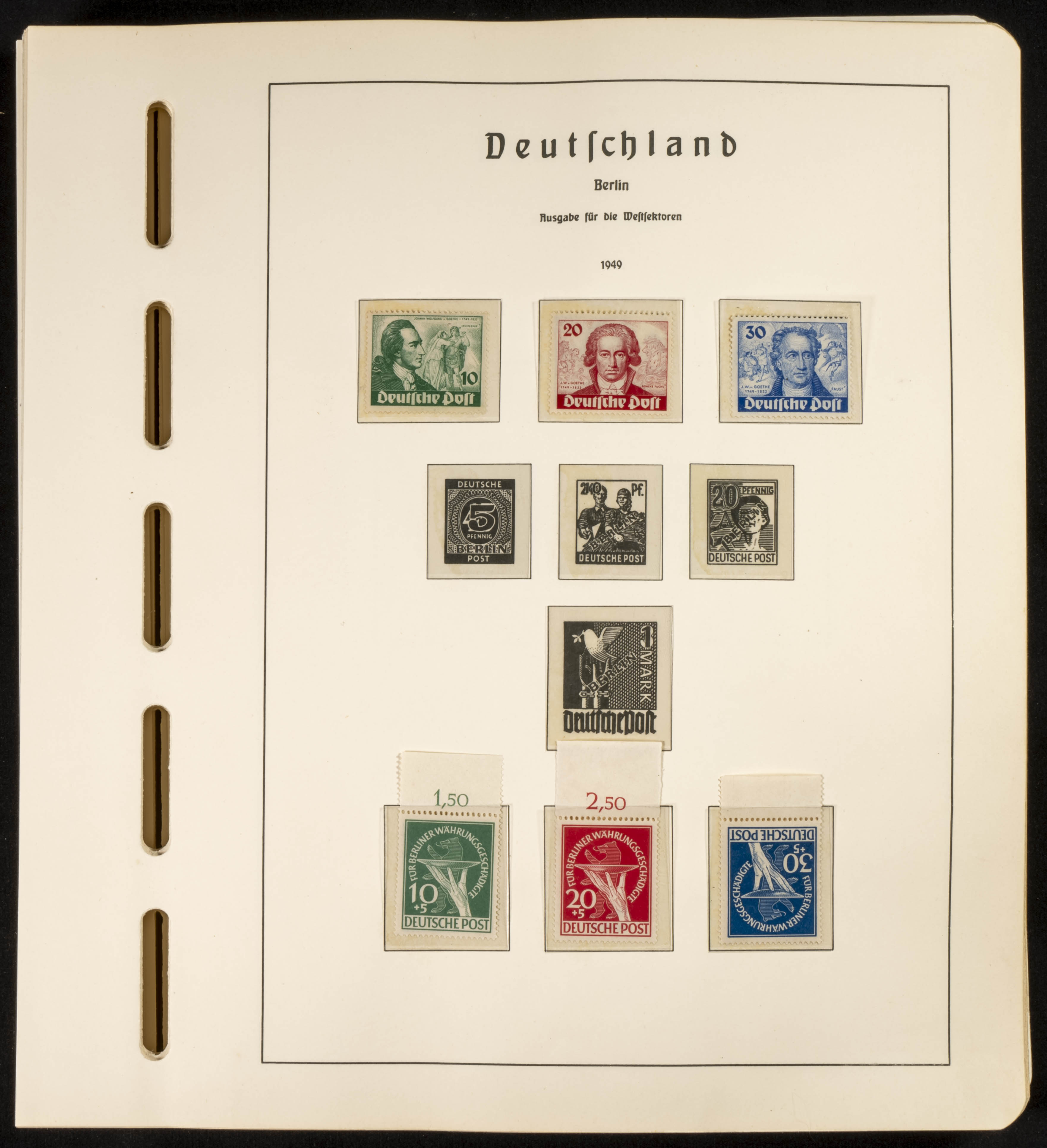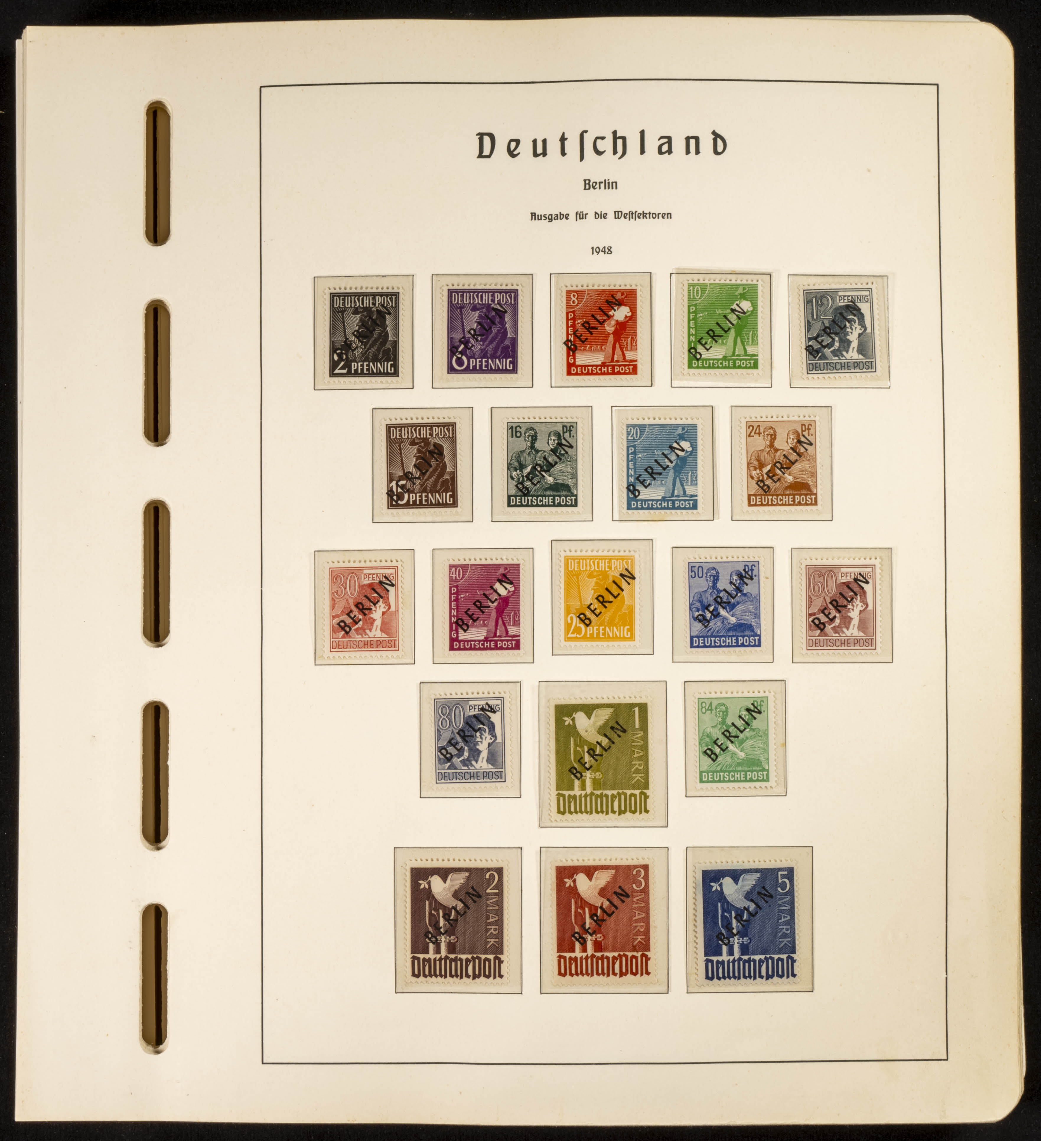 ★★/★(1949ca). Interesante y prácticamente completa colección de Alemania Berlín entre 1949 y 1990, en nuevo sin fijasellos y a falta de la serie de cuatro valores con sobrecarga Berlin (Yvert 47/50) y Monumentos (Yvert 28/46), la hoja bloque de Reforma Monetaria y algún sello de escaso valor con fijasellos. ALTISIMO VALOR DE CATALOGO. IMPRESCINDIBLE EXAMINAR.