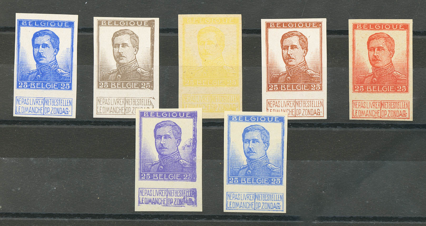 (★)1912. Interesante conjunto de siete ENSAYOS DE COLOR (sin dentar) del 25 cts de Alberto I. MAGNIFICOS.