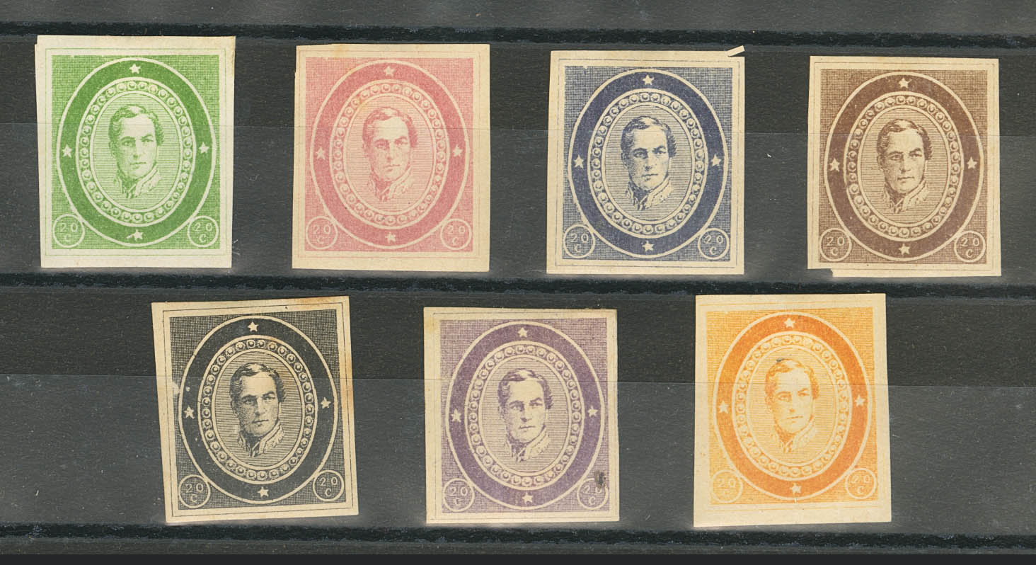 (★)(1912ca). Conjunto de siete PRUEBAS DE COLOR (sin dentar) de un diseño no adoptado del 20 cts con cuatro estrellas en los bordes del óvalo. MAGNIFICAS Y RARAS.