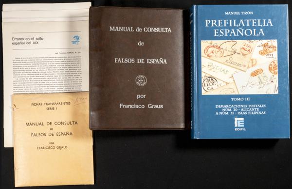 (1985ca). Conjunto de diversas publicaciones y catálogos, destacan PREFILATELIA ESPAÑOLA Tomo III (Demarcaciones Nº20 a 31 que incluye Cuba, Puerto Rico y Filipinas), MILITARIA 85 los dos tomos de Armando Fernández-Xesta, MANUAL DE CONSULTA DE FALSOS DE ESPAÑA, Tomo I con fichas sueltas y EL CORREO ESPAÑOL EN AMERICA. A EXAMINAR.