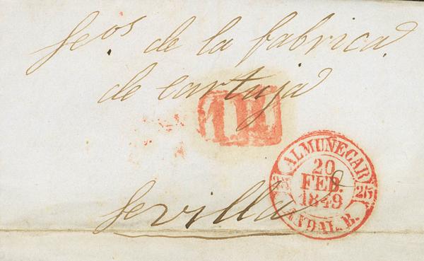 1849. ALMUÑECAR (GRANADA) a SEVILLA. Baeza ALMUÑECAR / ANDAL.B., en rojo. MAGNIFICA Y MUY RARA, ESPECIALMENTE CON ESTA ESPECTACULAR ESTAMPACION.