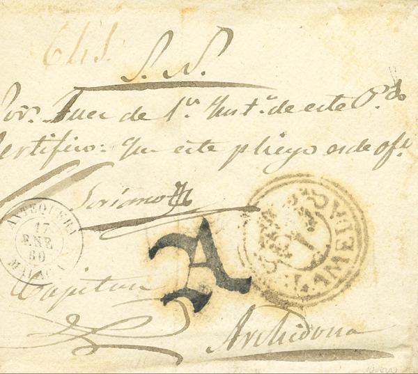 1860. ALAMEDA (MALAGA) a ARCHIDONA. Marca de abono "A", en negro de Antequera aplicada en tránsito (P.E.10) edición 2004. MAGNIFICA Y RARA.