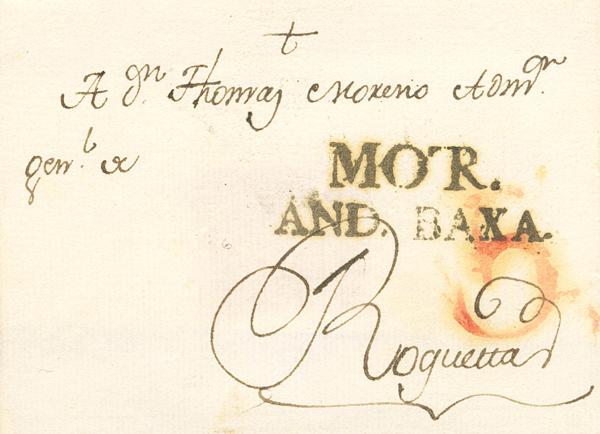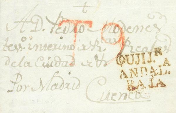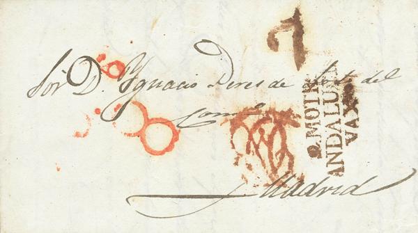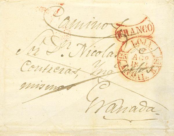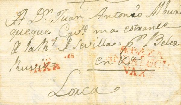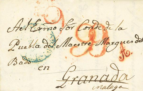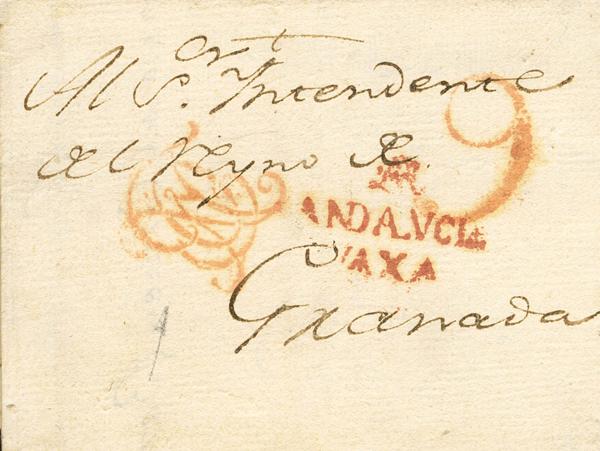 1812. MALAGA a GRANADA. Marca MA / ANDALVCIA / VAXA, en rojo y anagrama de Granada, en rojo aplicado a la llegada (P.E.37) edición 2004. MAGNIFICA Y RARISIMA.