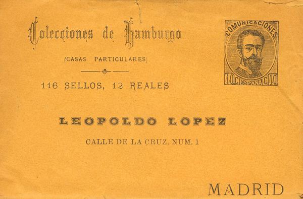 (★)(1900ca). Sobre del comerciante filatélico Leopoldo López con la reproducción del 40 cts de Amadeo, conteniendo ciento dieciséis sellos (fiscales o particulares) de HAMBURGO. MAGNIFICO Y MUY CURIOSO SOBRE PROPAGANDISTICO DEL SIGLO XIX, SE TRATA DEL PRIMER COMERCIANTE FILATELICO DE ESPAÑA, SIN DUDA PIEZA DE GRAN INTERES HISTORICO-FILATELICO.