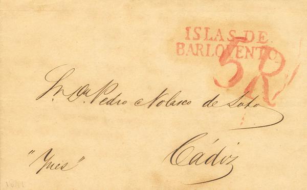 1841. LA HABANA a CADIZ. Marca ISLAS DE BARLOVENTO, en rojo de Cádiz aplicada para señalar la correspondencia procedente de las Antillas (P.E.63) edición 2004. MAGNIFICA.