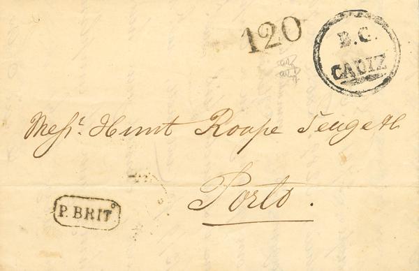 1854. CADIZ a OPORTO (PORTUGAL). Marcas B.C. / CADIZ, de la Agencia Consular Británica (P.E.78) edición 2004 y P.BRITº, en negro aplicada en tránsito por Lisboa para la correspondencia recibida por barco y porteo "120" (reis). MAGNIFICA Y RARA.