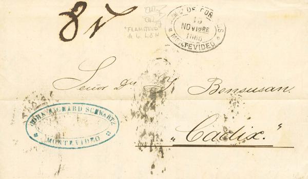 . MONTEVIDEO a CADIZ. Fechador oval ADMON DE CORREOS / MONTEVIDEO y porteo manuscrito "8 R" (reales), al dorso fechador P.TRANSATLANTICO, aplicado en tránsito por Lisboa y marca "LISTA" de llegada. MAGNIFICA Y RARA.