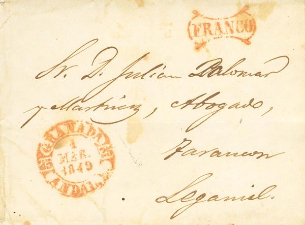 1849. GRANADA a LEGANIEL (CUENCA). Baeza GRANADA / ANDAL.B. (Tipo I) y marca de uso general FRANCO (P.E.31) edición 2004. MAGNIFICA Y MUY RARA.
