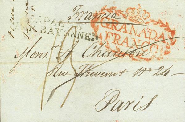1825. GRANADA a PARIS (FRANCIA). Marca GRANADA / FRANCO (P.E.29) edición 2004. MAGNIFICA Y RARA.
