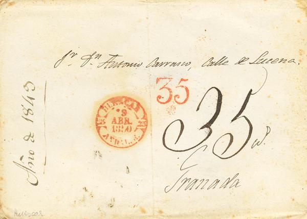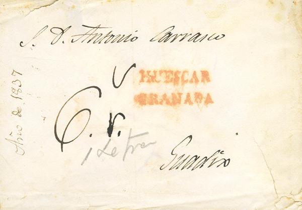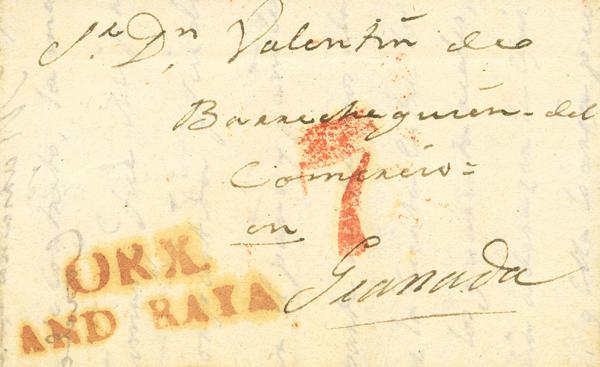 1843. CARATAUNAS (GRANADA) a GRANADA. Marca ORX / AND.BAXA, en rojo de Orgiva (P.E.1) edición 2004. MAGNIFICA Y RARA.