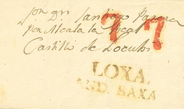 1838. LOJA (GRANADA) a CASTILLO DE LOCUBIN (JAEN). Marca LOXA / AND.BAXA, en marrón (P.E.5) edición 2004. MAGNIFICA.