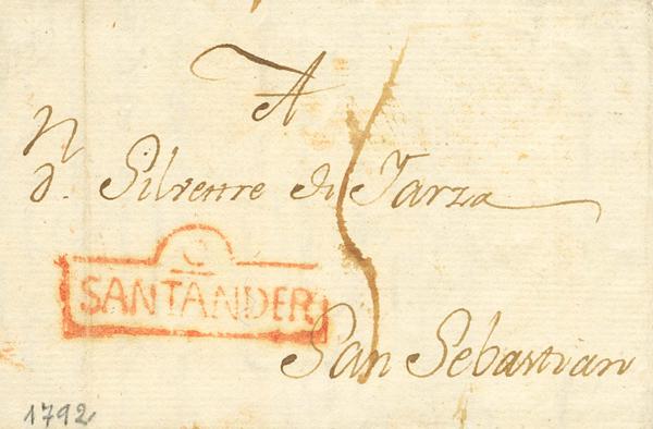 1792. SANTANDER a SAN SEBASTIAN. Marca C / SANTANDER, en rojo (P.E.6) edición 2004. MAGNIFICA Y RARA.
