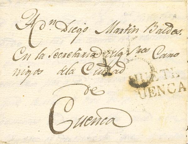 1815. OLMEDA DE LA CUESTA (CUENCA) a CUENCA. Marca HUETE / CUENCA, en negro (P.E.1) edición 2004. MAGNIFICA Y EXTRAORDINARIAMENTE RARA, NO RESEÑADA EN ESTE COLOR EN LA OBRA DE TIZON.