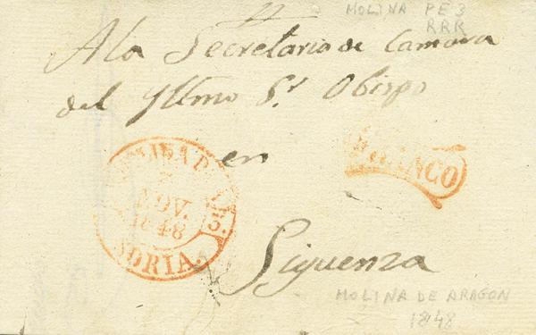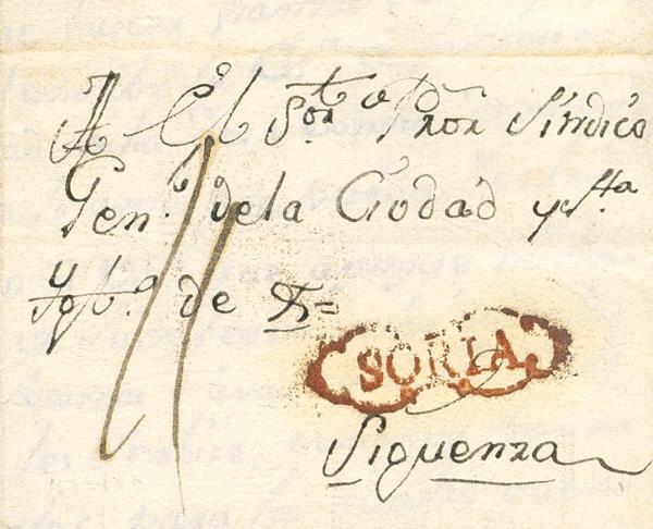 1796. MOLINA DE ARAGON (GUADALAJARA) a SIGÜENZA. Marca SORIA, en rojo. MAGNIFICA Y EXTRAORDINARIAMENTE RARA, NO RESEÑADA EN EL TIZON.