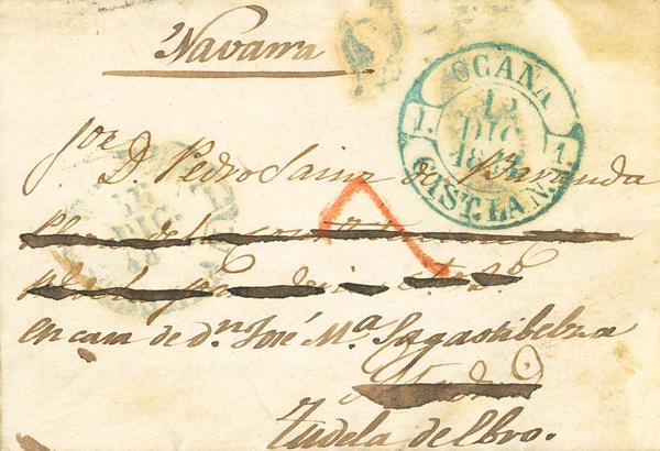 1844. VILLARRUBIA DE SANTIAGO (TOLEDO) a MADRID, reexpedida a TUDELA (NAVARRA). Baeza OCAÑA / CAST. LA N., en azul. MAGNIFICA Y MUY RARA.