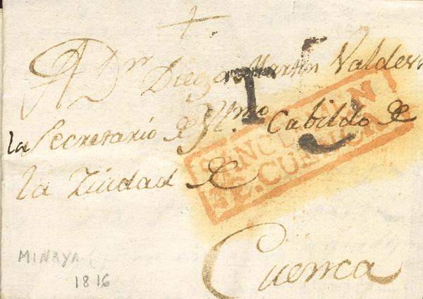 1816. MINAYA (ALBACETE) a CUENCA. Marca SAN CLEMEN / TE, CUENCA (P.E.5) edición 2004. MAGNIFICA Y RARISIMA.
