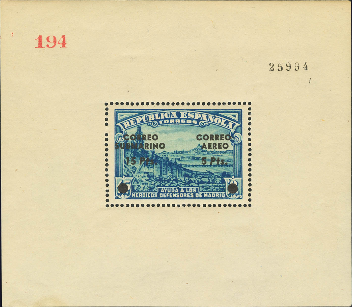★★ 758FN. 1938. Hoja bloque. Sobrecarga CORREO / SUBMARINO / 15 PTS / CORREO / AEREO / 5 PTS. MAGNIFICA Y RARA.