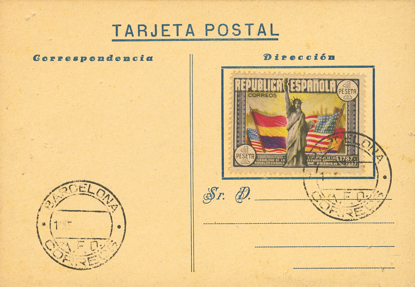 763. 1938. 1 pts multicolor sobre Tarjeta Postal. Matasello BARCELONA / CORREOS. BONITA.