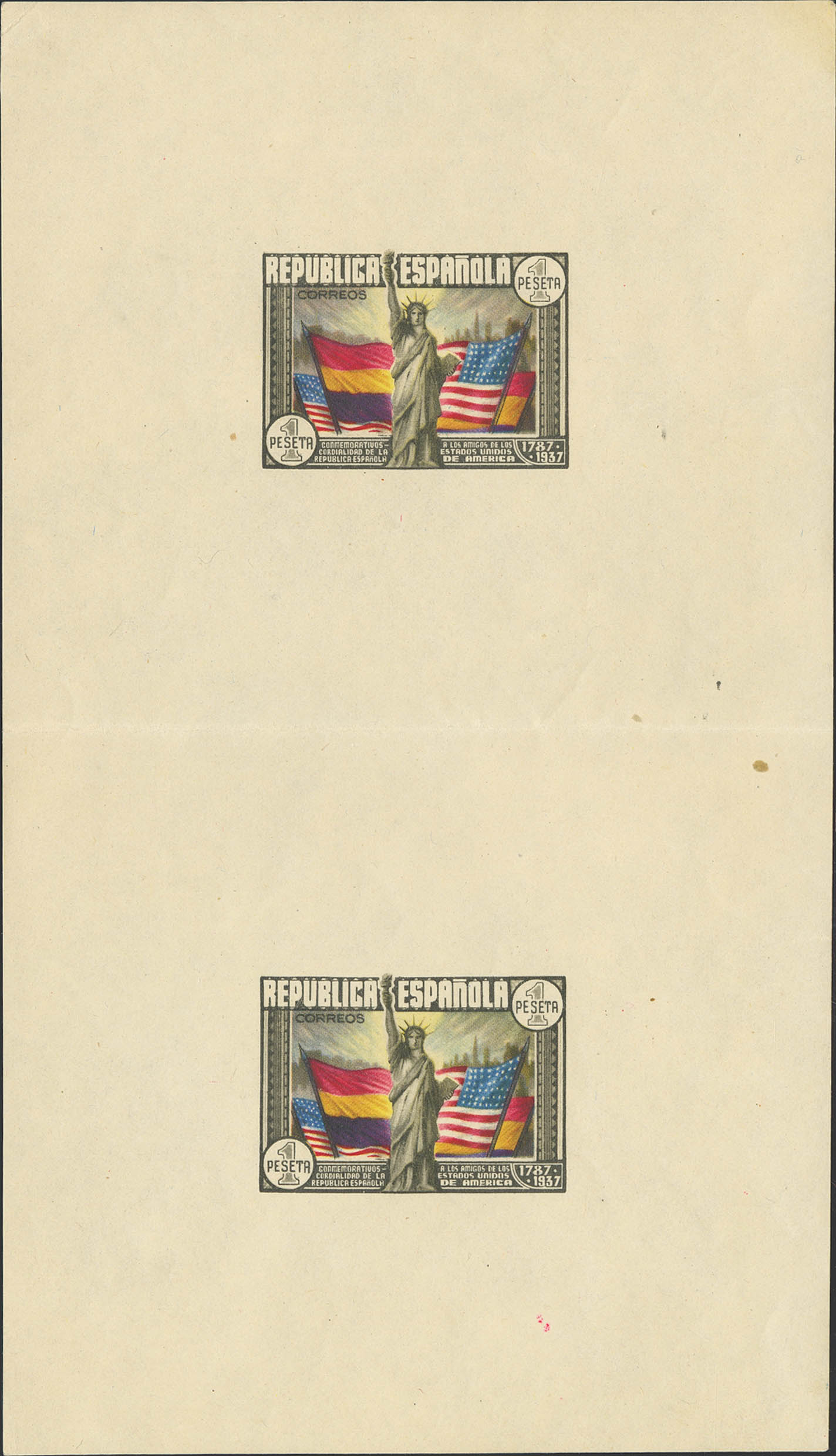 ★★ 764ns(2). 1938. Hoja bloque, pareja vertical. SIN DENTAR y SIN NUMERACION. MAGNIFICA Y MUY RARA.