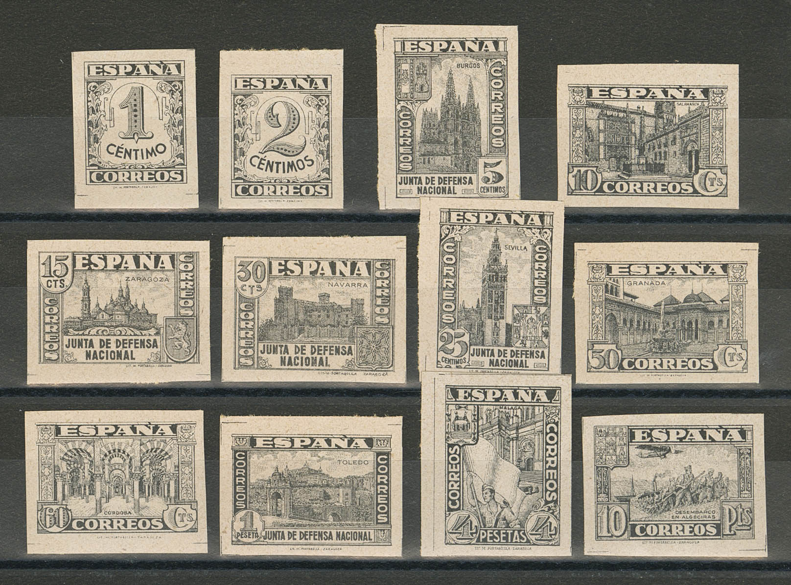 (★) 802/13P. 1936. Serie completa, doce valores. PRUEBAS DE LOS REPORTES DEFINITIVOS. MAGNIFICA Y MUY RARA.