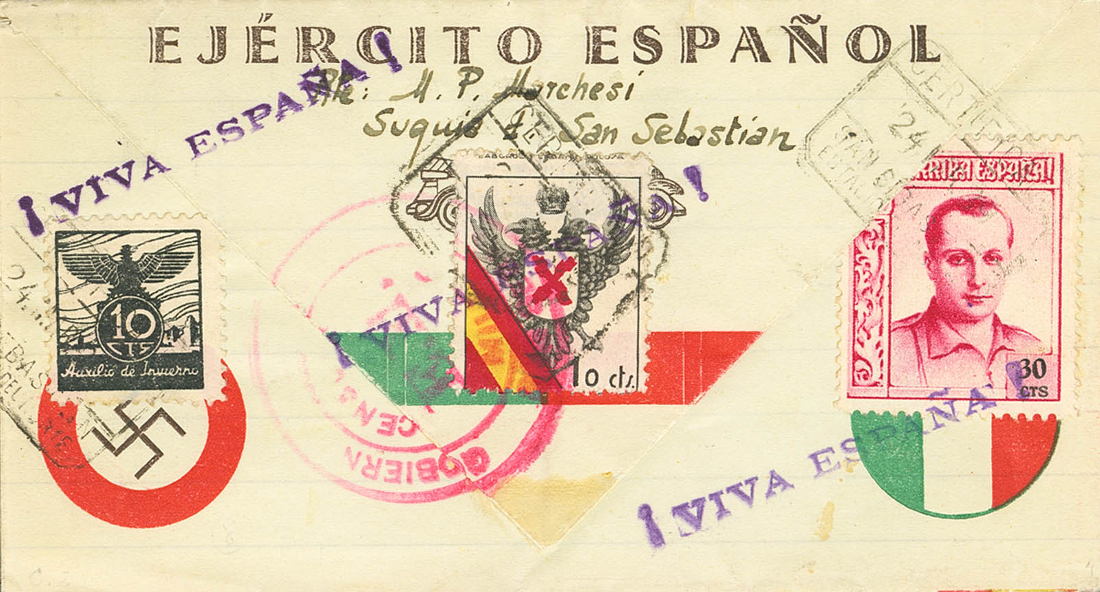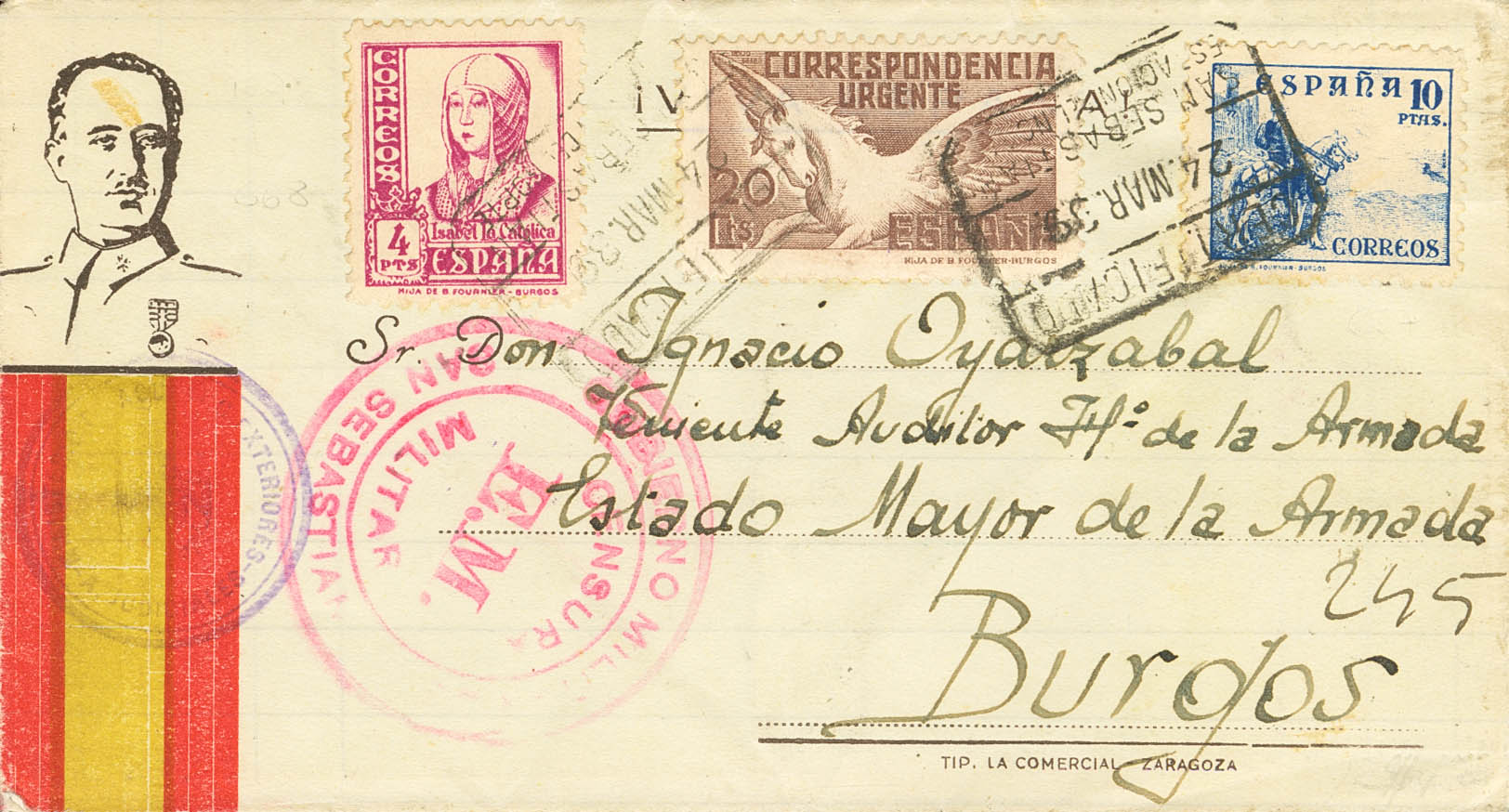 829, 830. 1938. 4 pts rosa y 10 pts azul. Certificado de SAN SEBASTIAN a BURGOS. MAGNIFICA Y ESPECTACULAR CON EL 4 PTS Y 10 PTS.