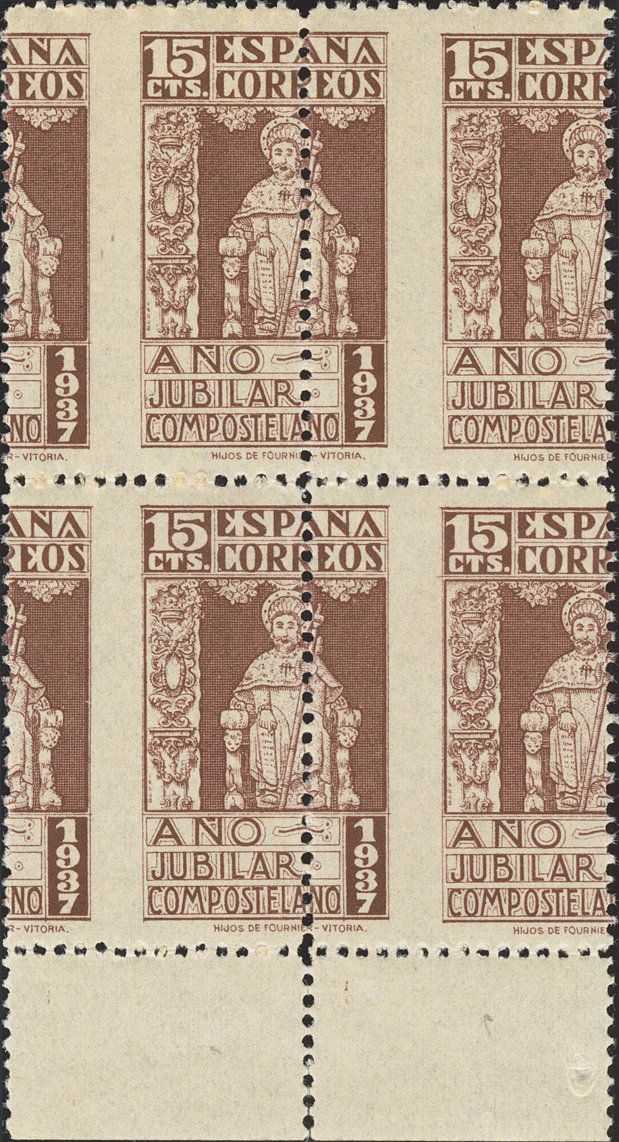 ★★ 833dx(4). 1937. 15 cts castaño, bloque de cuatro y borde de hoja. DENTADO DESPLAZADO. MAGNIFICO Y ESPECTACULAR. Edifil 2021: ++92 Euros
