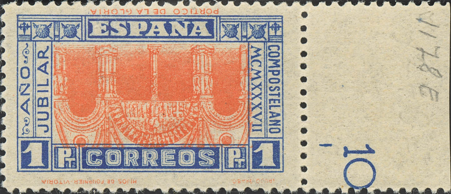 ★★ 835ei. 1937. 1 pts azul y naranja, borde de hoja. CENTRO INVERTIDO. MAGNIFICO Y RARO. Edifil 2021: 600 Euros