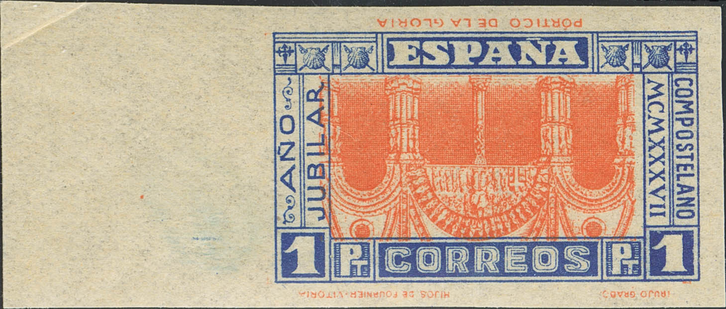 ★★ 835eis. 1937. 1 pts azul y naranja, borde de hoja. CENTRO INVERTIDO y SIN DENTAR. MAGNIFICO Y RARISIMO. Cert. CEM. Edifil 2021: 1.300 Euros