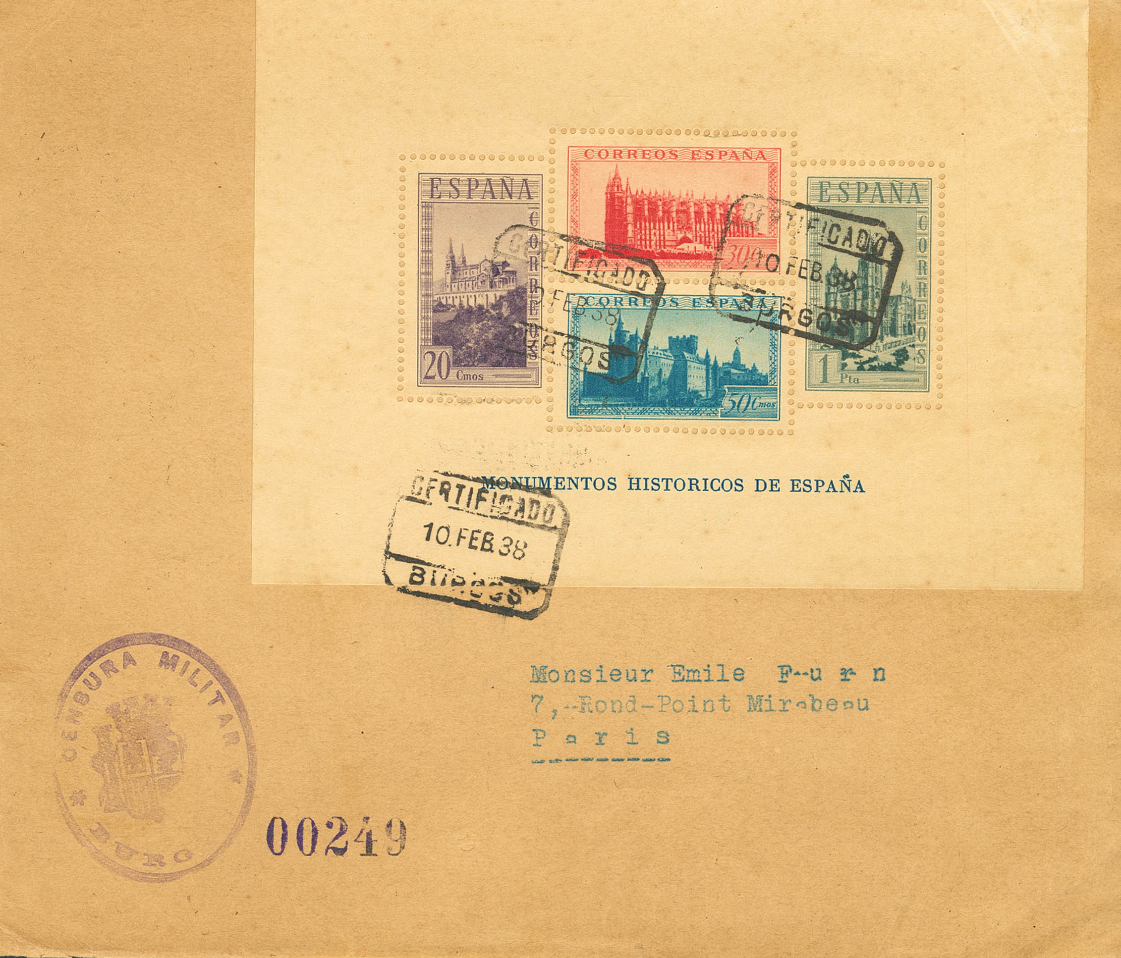 847. 1938. Hoja bloque (muy tonalizada). Certificado de BURGOS a PARIS (FRANCIA). Al dorso llegada. MAGNIFICA.