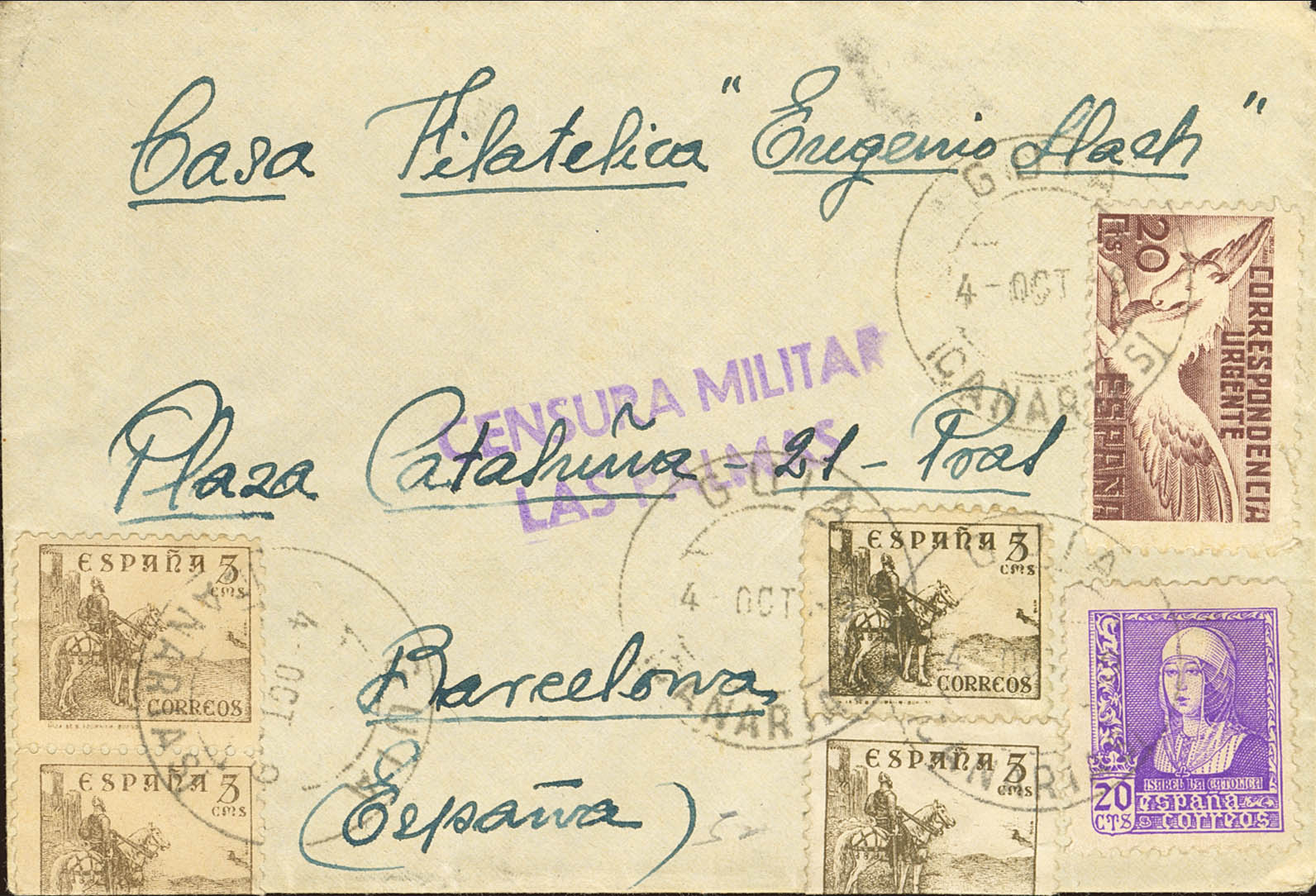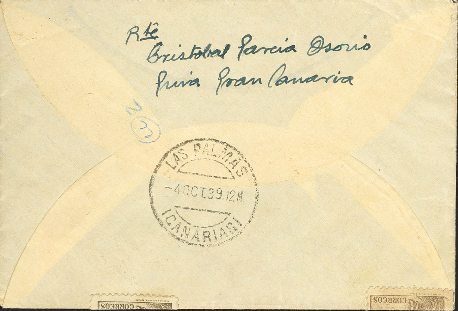 861. 1939. 20 cts castaño y diversos valores. GUIA (CANARIAS) a BARCELONA. Al dorso tránsito. MAGNIFICA.