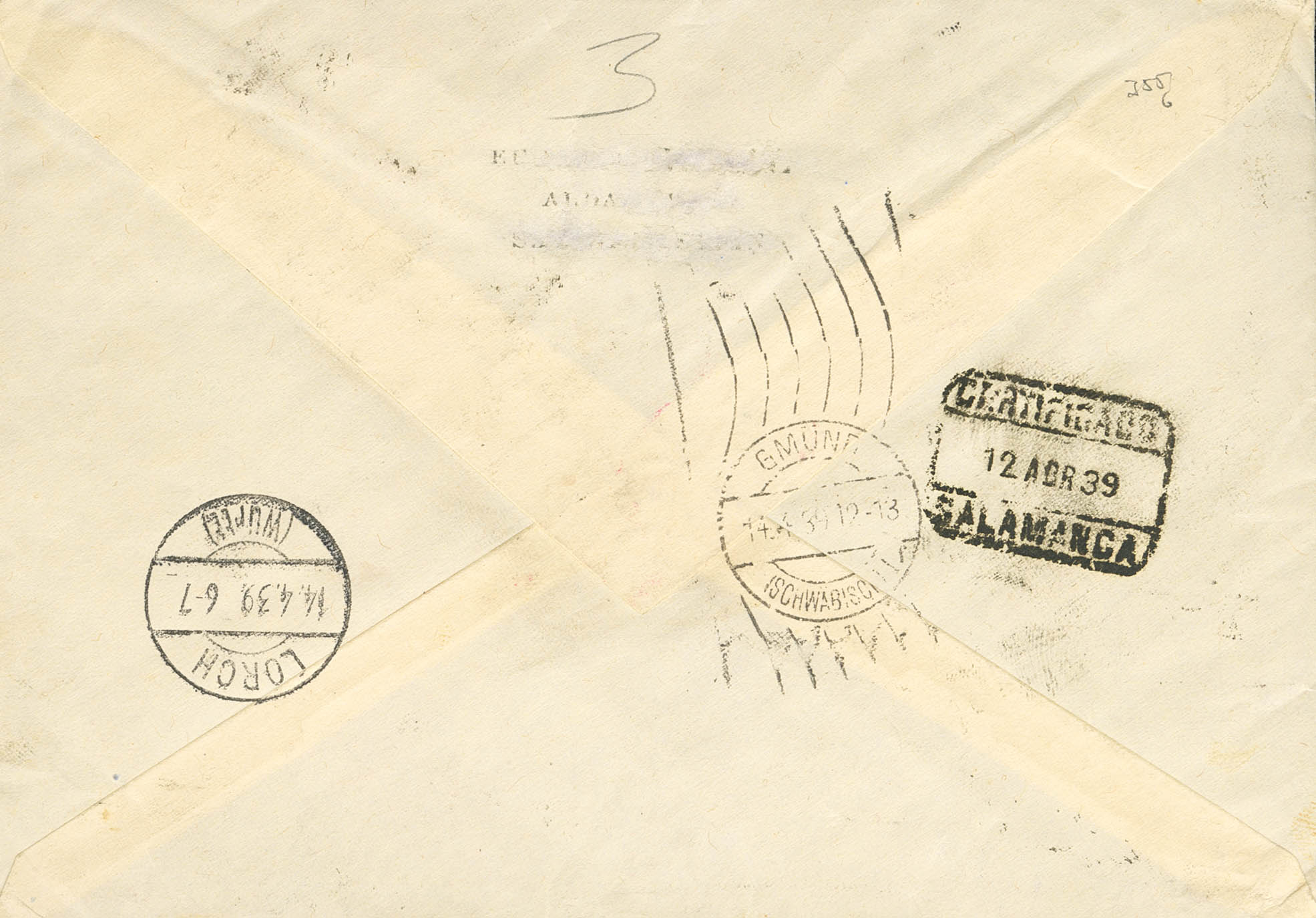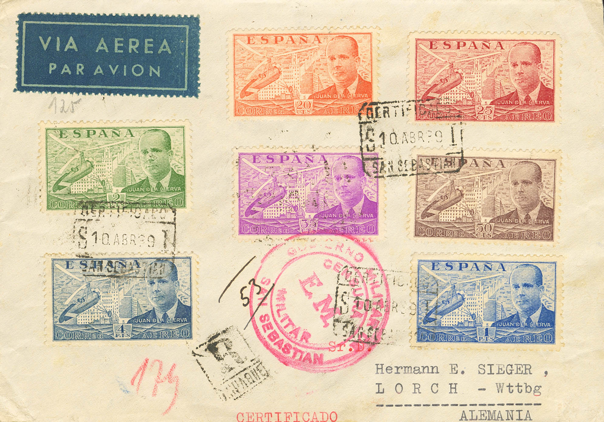880/86. 1939. Serie completa. Certificado de SAN SEBASTIAN a LORCH (ALEMANIA). Al dorso llegada. MAGNIFICA.