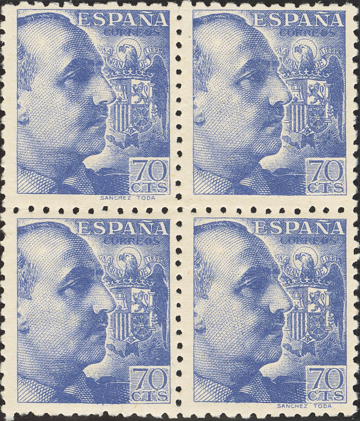 ★★ 929(2), 929t(2). 1939. 70 cts ultramar, bloque de cuatro. Dos sellos PIE DE IMPRENTA "SANCHEZ TODA". MAGNIFICO. Edifil 2021: +26 Euros