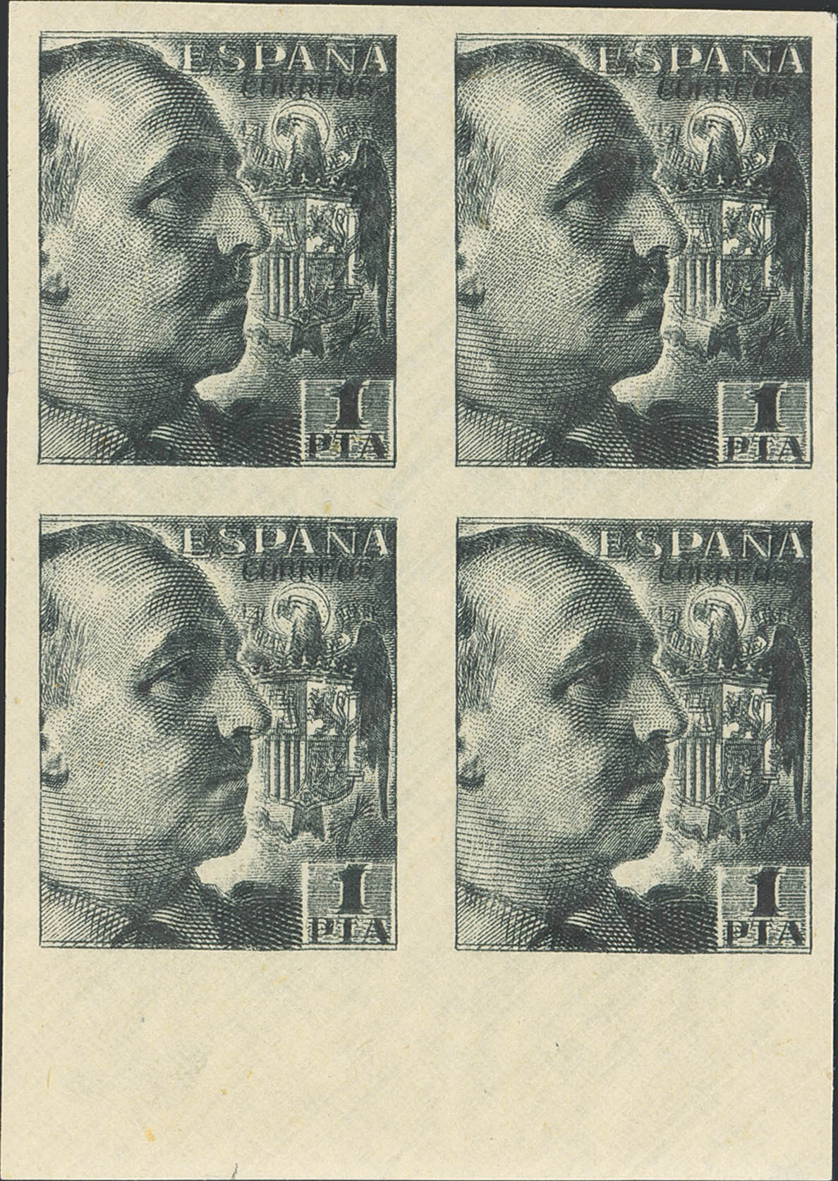 ★★ 930eds(4). 1940. 1 pts negro, bloque de cuatro, borde de hoja. DOBLE IMPRESION y SIN DENTAR. MAGNIFICO. Edifil 2021: 300 Euros