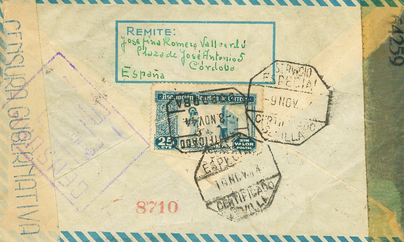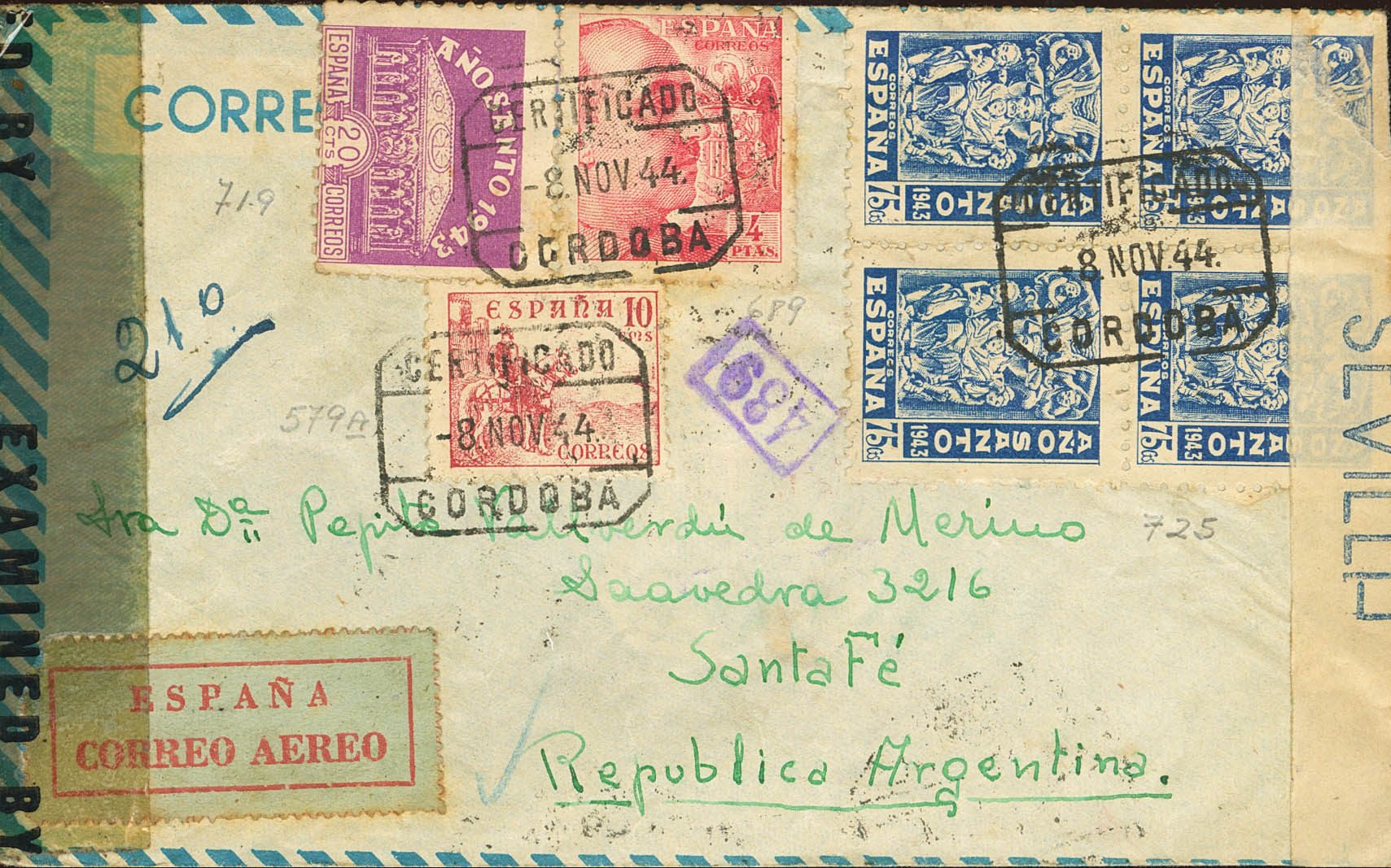 933. 1944. 4 pts rosa y diversos valores. Certificado de CORDOBA a SANTA FE (ARGENTINA). Al dorso tránsito. MAGNIFICA Y ESPECTACULAR.